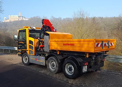 Auch für den Winterdienst ist das Fahrzeug bestens gerüstet. Mit einem BOKIMOBIL HY 1352 mit serienmäßigem 2-Gang-Untersetzungsgetriebe kann auch eine Schneefräse kraftvoll betrieben werden.