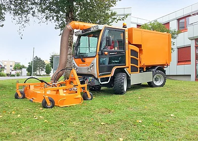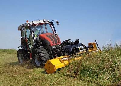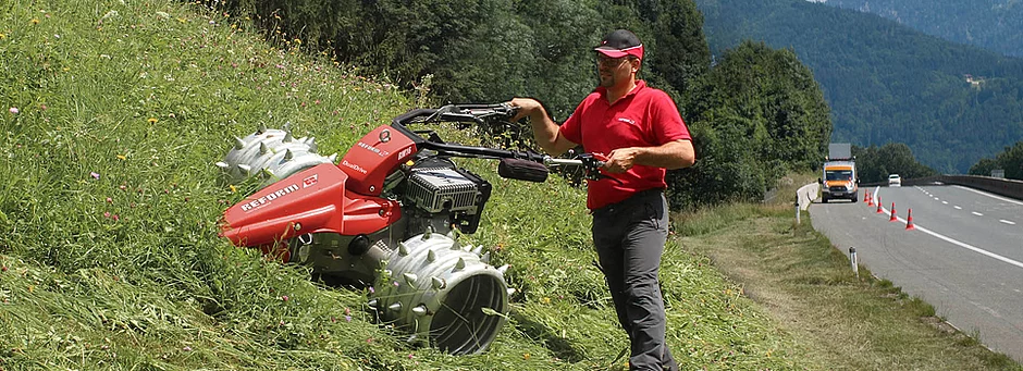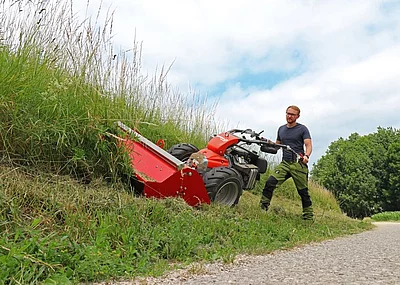 Der tiefe Geräteschwerpunkt und die breite Achse sorgen für Kippstabilität bis in extreme Steigungen von bis zu 120%. Die konstruktiv weit nach hinten gebaute Achse garantiert ohne Zusatzgewichte in jeder Situation ein hohes Balkenauflagegewicht. Das ebenfalls neu entwickelte Rapid Soft-Holmlager minimiert Schwingungen und Vibrationen nochmals enorm, und garantiert so einen hohen Komfort und kräfteschonendes Arbeiten auch über lange Einsatzzeiten. Der seitlich schwenkbare Holm ermöglicht bequemes Arbeiten auch entlang von Hindernissen oder unter Büschen hindurch.