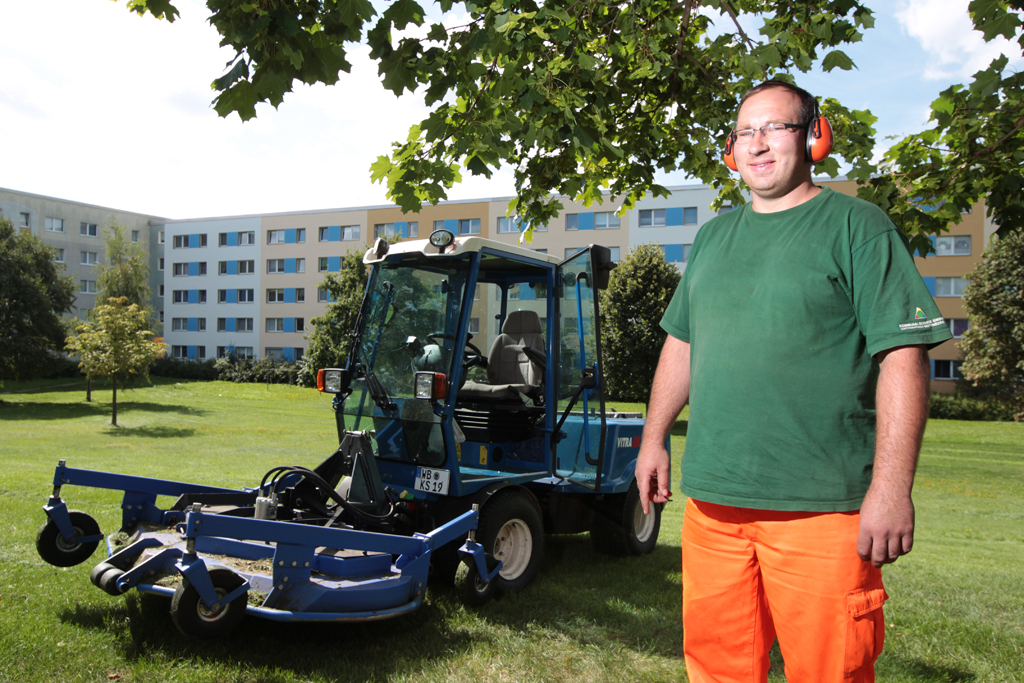 Die Rasenflächen um die 4-stöckigen Plattenbauten werden im Mulchverfahren extensiv gemäht und bearbeitet. Durchschnittlich 3-4 mal in der Vegetationsperiode zwischen April bis Oktober mäht er die Wiesen auf mittlere Schnitthöhe ab. An extensive Flächen stellen die Nutzer weniger exklusive Ansprüche an das Erscheinungsbild, die Belastung sowie die Narbendichte. Hier ist Funktionalität und reduzierter Pflegeaufwand gegenüber einem perfekten, unkrautfreien Vorzeigerasen gefragt.