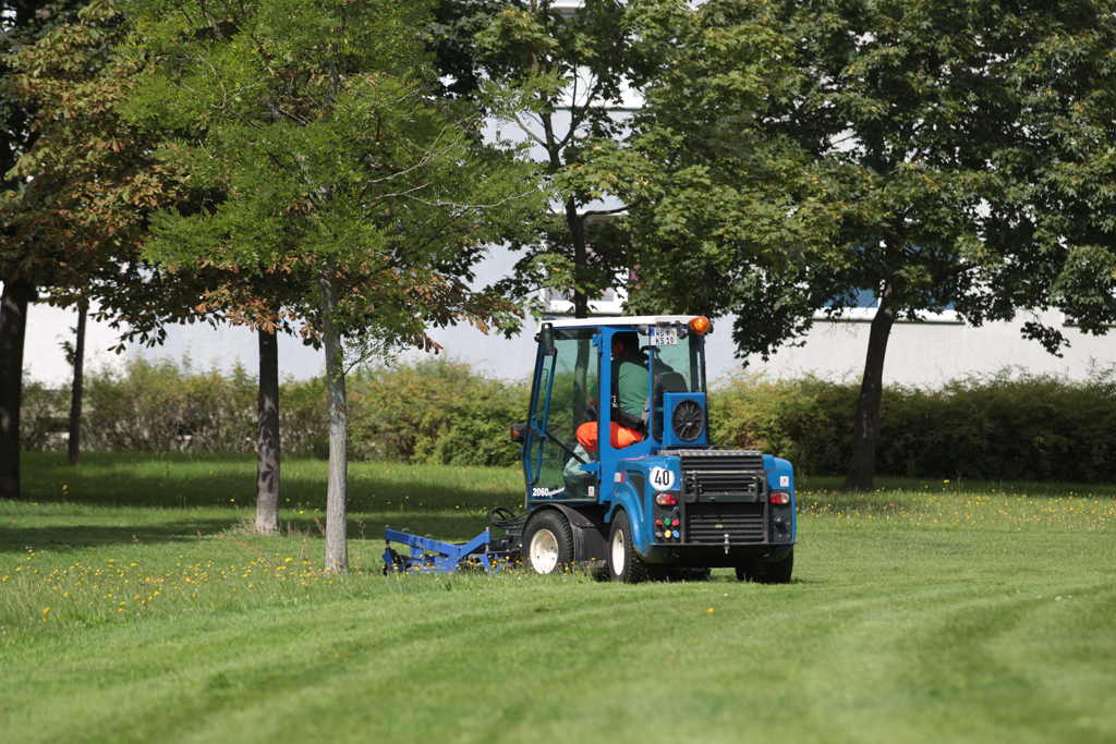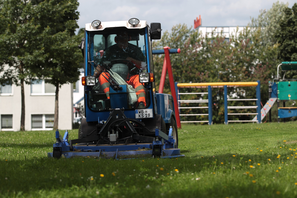 Ein zentraler Aufgabenbereich liegt in der ganzjährigen Pflege und Unterhaltung der weitläufigen städtischen Grünflächen. Auf Spielplätzen, zwischen Wohn- und Parkanlagen oder auf brachen Flächen schießt das Gras in diesem regenreichen Sommer besonders prächtig. „Jetzt ist Hochsaison“, betont Christian Ziepel (31), mit einer dynamischen Daumen-hoch-Geste. Von April bis Anfang Oktober zählt der emsige Grünpflege-Profi mit seiner blauen Arbeitsmaschine, einem ISEKI-VITRA Knicklenker, gewissermaßen zum Stadtbild. Den Knicklenker fährt er erst seit November letzten Jahres. Mittlerweile attestiert er dem ISEKI-Geräteträger in seinem „Arbeitszeugnis“ mehr als 600 geleistete Betriebsstunden zur jederzeit vollsten Zufriedenheit. „Damals“ hat er sein Pensum mit einer alten, etwas ungelenken Mähmaschine abgeleistet. Im Vergleich von gestern zu heute trauert er seinem treuen Großflächenmäher nicht mehr nach.