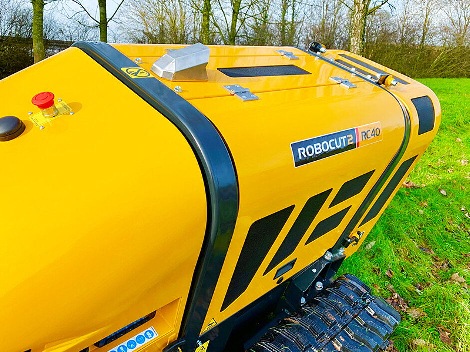 Doppelte Überrollschutzbügel und vollständig geschlossene Ganzmetall-Karosserieteile verhindern nicht nur das Eindringen von Staub und Schmutz, sondern sorgen auch bei Arbeiten unter rauen Bedingungen für hervorragenden Schutz und die Langlebigkeit der Maschine. Mit der bewährten Hetronic-Handfernsteuerung lässt sich der Robocut2 RC40 intuitiv und einfach bedienen. Die Arbeitsreichweite beträgt 150 Meter. Zwei große Joysticks ermöglichen die Steuerung von Bewegung, Lenkung und Anbaugeräten, während wichtige Funktionen hinsichtlich Getriebe, Rotordrehzahl, Geschwindigkeitsstufe, Kühlerselbstreinigung und Not-Aus per Tastendruck abgerufen werden können.