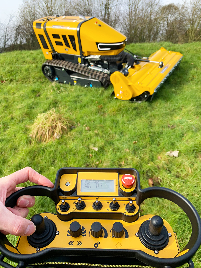 Dabekausen vertreibt ab sofort neben den in 2019 eingeführten Modellen der McConnel-Robocut-GEN-II-Baureihe auch die jüngste Neuentwicklung, den RC40 mit 40 PS. Dieses neue Mittelklassemodell schließt die Lücke zwischen dem RC28 als kleinsten Mähroboter von McConnel mit 28 PS und den größeren Hochleistungs-Maschinen mit 56 bzw. 75 PS. Der Robocut2 RC40 wurde speziell für die Bewältigung von schwierigem Terrain entwickelt. Er verfügt über einen niedrigen Schwerpunkt und robuste Gummiraupen und kann so problemlos in jedem Gelände und bei Steigungen bis zu 55 Grad eingesetzt werden. Dabei bleibt der Maschinenführer dank der Fernsteuerung immer außerhalb der Gefahrenzone.