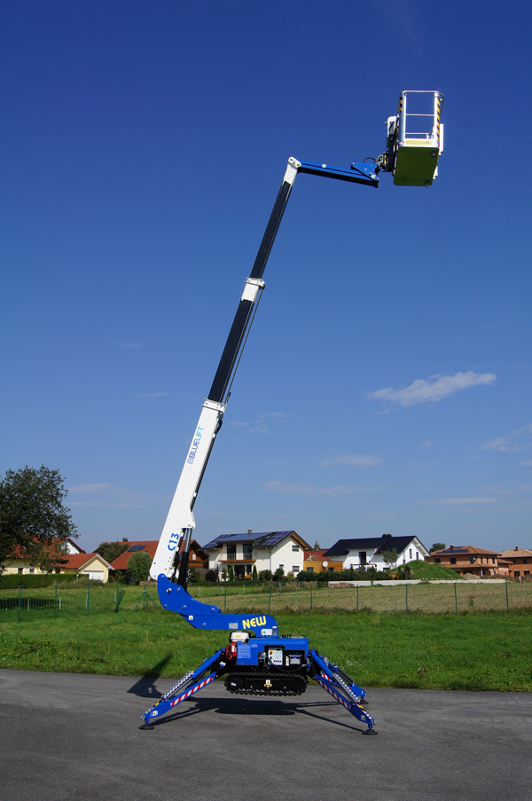 Im Segment der Raupenarbeitsbühnen entwickelte Bluelift die Neuheit R130C mit 3-stufigen Teleskopausleger mit beweglichem Korbarm. Bei 1.450kg Eigengewicht erreicht die Bühne 13m Arbeitshöhe und stattliche 8m seitliche Reichweite bei 80kg Korblast. Dazu sind umfangreichen Sonderausstattungen wie z.B. der drehbare Arbeitskorb oder verschiedene Antriebsvarianten erhältlich. Neu mit emissionsfreiem Batteriebetrieb für Einsätze im Indoor-Bereich oder in lärm- und emissionssensiblen Zonen.