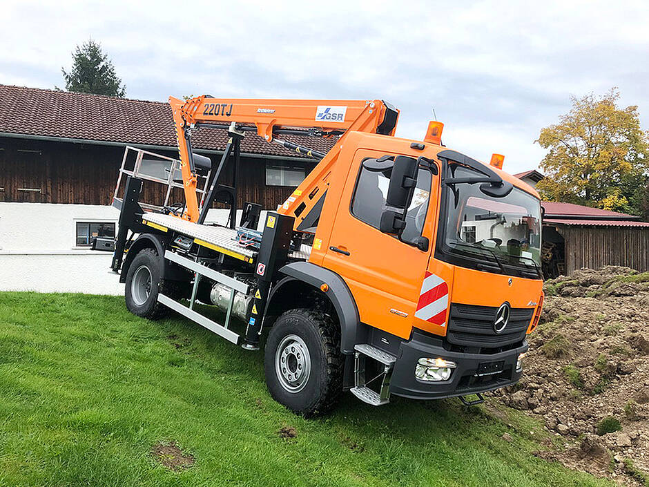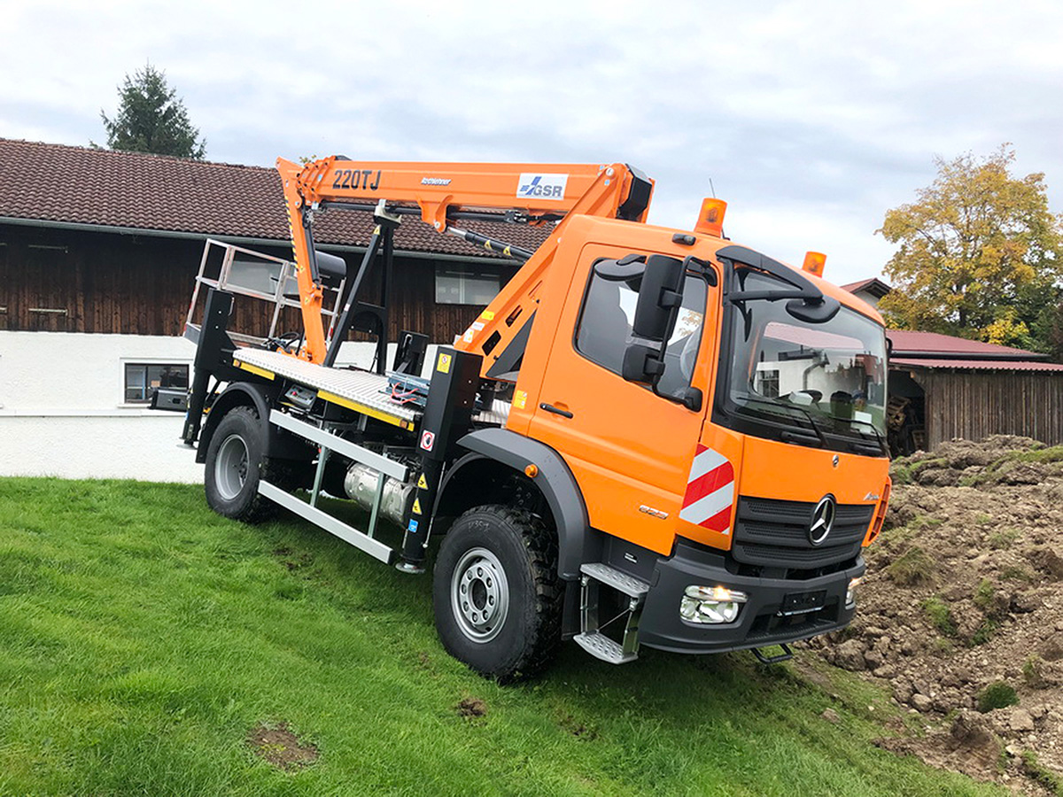 Aufgrund seines geländegängigen Allradantriebs wurde das Trägerfahrzeug ausgewählt. Dieser ermöglicht es, auch auf schwierigem Untergrund stabil zu arbeiten. Zudem bietet der Atego eine hohe Wendigkeit, die für den Einsatz auf engen Baustellen oder in städtischen Gebieten besonders vorteilhaft ist. All diese Eigenschaften machen das Fahrzeug zu einem zuverlässigen Partner für die vielseitigen Anforderungen des Marktes.