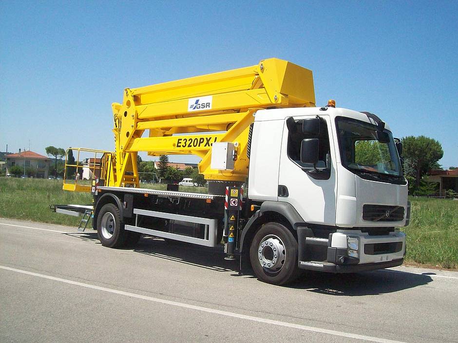 • Die Lkw-Arbeitsbühne GSR E290 PX erreicht 29 m Arbeitshöhe und 15,5m seitliche Reichweite bei voller Korblast. Sie kann auf verschiedene Trägerfahrzeuge mit einem zulässigen Gesamtgewicht von bis zu 7,5 t oder mehr aufgebaut werden.