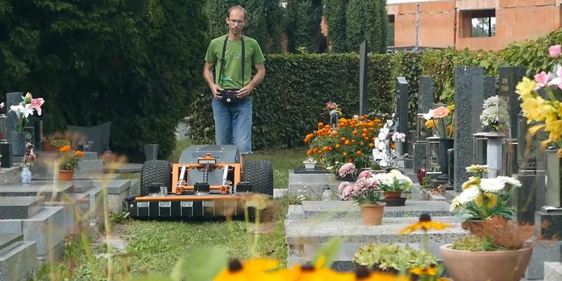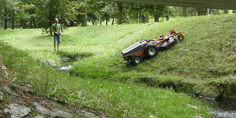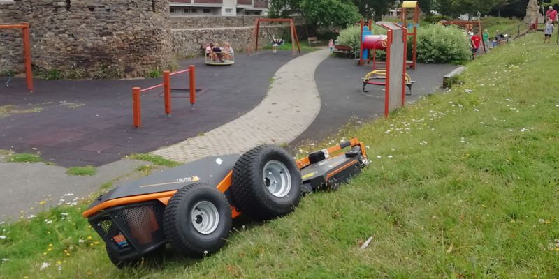 Mit der Funk-Fernbedienung kann der Hybridmäher aus sicherer Entfernung präzise gesteuert werden. Der Bediener hat die Umgebung voll im Blick, ohne Belastung durch Lärm und Staub. Raymo ist nicht nur ein Mäher, sondern auch als Werkzeugträger für zusätzliche Elektrowerkzeuge und Anbaugeräte konzipiert. Landschaftsgärtner können unterschiedlichste Arbeiten schneller und mit nur einem Gerät erledigen – das spart Aufwand und Kosten. Demnächst bietet Rumsauer weitere Komponenten an, beispielsweise zum Schneeräumen, Vertikalschneiden, Fegen, Laubblasen oder Abkanten.