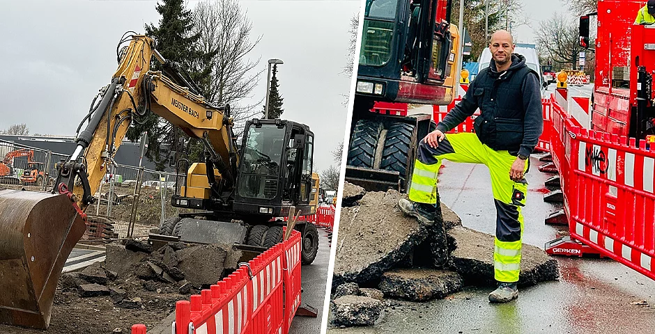 Es ist 9.40 Uhr, auf einer vielbefahrenen Straße in Düsseldorf Holthausen im Industriegebiet. Rote Zäune sperren die kleine Baustelle ab. Mittendrin: der SANY-Mobilbagger SY155W, der gerade dafür eingesetzt wird, die Asphaltschicht abzutragen. Eine neue Einfahrt soll entstehen, dafür muss der Bürgersteig abgesenkt und der Straßenbelag erneuert werden. Kein Problem für Meister Bach und sein Team.