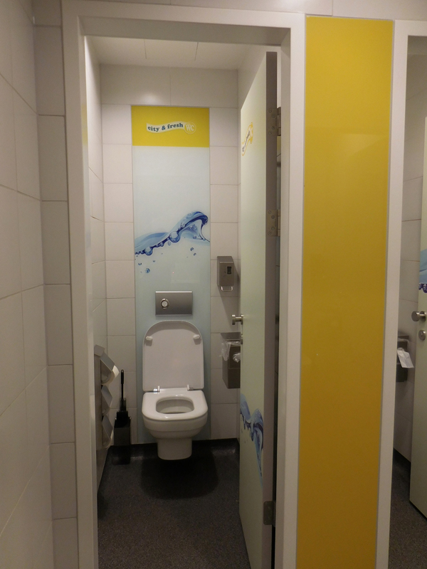 Zurück nach Augsburg. Seit knapp zweieinhalb Jahren ist die city&fresh-Anlage am Königsplatz jetzt in Betrieb – und glänzt wie am ersten Tag. Knapp 60 Quadratmeter groß (inklusive Serviceraum und Technikbereiche) ist die Anlage, davon allein 5 Quadratmeter das Behinderten-WC. Die Herrentoilette verfügt über zwei Kabinen, drei wasserlose Urinale und einen Doppelwaschtisch, die Damentoilette über drei Kabinen und ebenfalls einen Doppelwaschtisch. Alle WC-Kabinen sind mit einer Zwangsspülung ausgestattet; die Auslösung der einzelnen Funktionen wie Spülung, Seife oder Wasser erfolgt berührungslos. Und noch ein wichtiges Detail in Sachen Sauberkeit und Hygiene: Verwendet wurde ein durchgängiger, fugenloser und damit besonders gut zu reinigender Kunstharzboden. Der Zugang erfolgt über sogenannte Speed-Stiles mit Kassenautomat (mit Geldwechselfunktion) und Wertbon-Ausgabe. Davor liegt die Behindertentoilette, die, wie bereits erwähnt, mit einem Babywickeltisch ausgestattet und rund um die Uhr zugänglich ist.