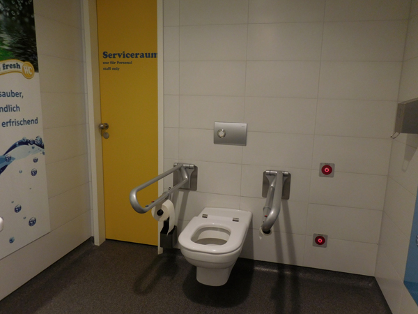 Dass solche neuen Anlagen nicht nur durch den TÜV Rheinland überwacht und nach ISO 9002 zertifiziert sind, sondern immer auch über ein rollstuhlgerechtes Behinderten-WC verfügen, versteht sich von selbst. Während für die Benutzung der regulären Toiletten ein kleiner Obolus erhoben wird, ist der Besuch dieser Behinderten-WCs kostenlos. Und mit einem CBF-Schlüssel jederzeit möglich – ein Schlüssel für öffentliche Behindertentoiletten, der deutschlandweit vom CBF Darmstadt vertrieben wird (CBF steht für Club Behinderter und ihrer Freunde in Darmstadt und Umgebung). Aber oft – und wie in Augsburg – ist die Behinderten-Toilette auch mit einem eigenen Münzeinwurf versehen, um beispielsweise Müttern den Zugang zu dem hier ebenfalls integrierten Wickeltisch zu ermöglichen.