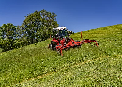 Ein weiterer Vorteil des Sauerburger Grip4 gegenüber dem vorher eingesetzten Hangtraktor ist die Stabilität am Seitenhang. Diese Allradtraktoren driften nicht so schnell ab, sondern bleiben in der Spur. Die große grasnarbenschonende Bereifung, die ganze Konzeption des Sauerburger Hangtraktors mit der besseren Bodenanpassung und schließlich die Driftlenkung schaffen diese Vorteile. Die Driftlenkung ist nach der Einzelachs-, Allrad- und Hundeganglenkung die vierte Lenkungsart: Mit dem Fahrhebel steuert der Fahrer die Hinterachse extra und kann an steileren Passagen besser ausgleichen. „Man ist flexibler.“