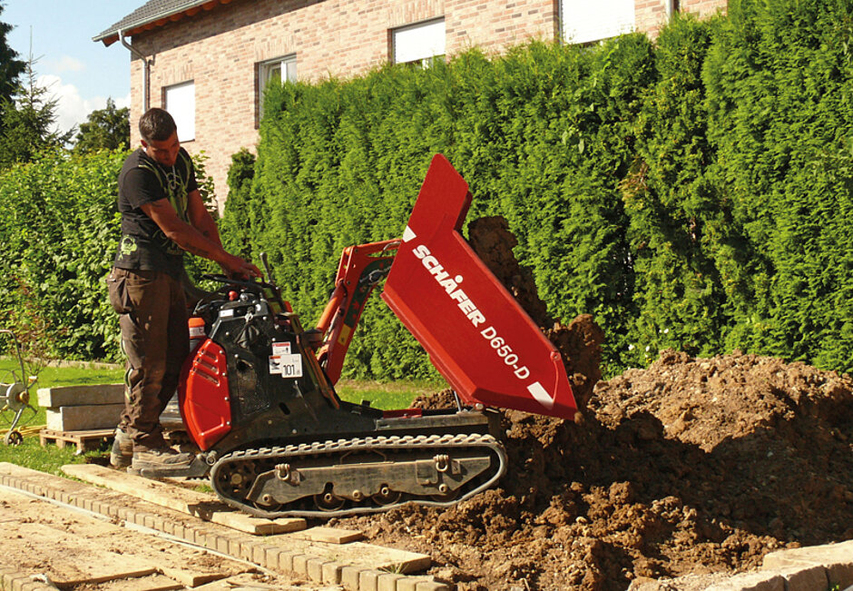 Diese kleine, aber bärenstarke Maschine ist nur 69,5 cm breit und 210 cm lang. Auch das Maschinengewicht ist mit 415 kg sehr gering. Aber die Nutzlast von 600 kg lässt aufhorchen. Damit können große Mengen an Erdreich, aber auch an Steinblöcken oder Betonplatten, Zementsäcken und anderem transportiert werden. „Ich brauche das hervorragende handwerkliche Können meiner Mitarbeiter, aber nicht ihre Muskelkraft. Deshalb sollen sie diese für den Materialtransport auch nicht über die Maßen einsetzen und deshalb werden sie von dem Schäfer Minidumper entlastet“, sagt Steil. Angetrieben wird der D650-D von einem 4,9 kW/6,7 PS starken Motor. Das ergibt eine Fahrgeschwindigkeit von bis zu 3,6 km/h. Manchmal noch wichtiger ist aber die Steigfähigkeit von 20°. Damit lassen sich selbst Baugruben befahren. Und die Ausstattung und Möglichkeiten dieses Schäfer Minidumpers haben ein hohes Niveau. Der Maschinist kann auf einer eigenen Standplattform mit dem Minidumper fahren. Die Standplattform lässt sich aber auch einfach abnehmen und hochklappen. Der hydrostatische Fahrantrieb garantiert eine präzise und einfache Steuerung des Dumpers. Die Lademulde wird hydraulisch gekippt. Gestartet wird der Dieselmotor über einen Elektrostarter und alle technischen Ausstattungen sind leicht zugänglich – auch der Tankeinfüllstutzen, was gerade auf GaLaBau-Baustellen von großem Vorteil ist.