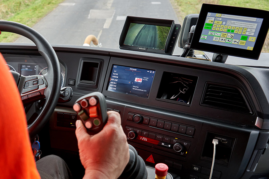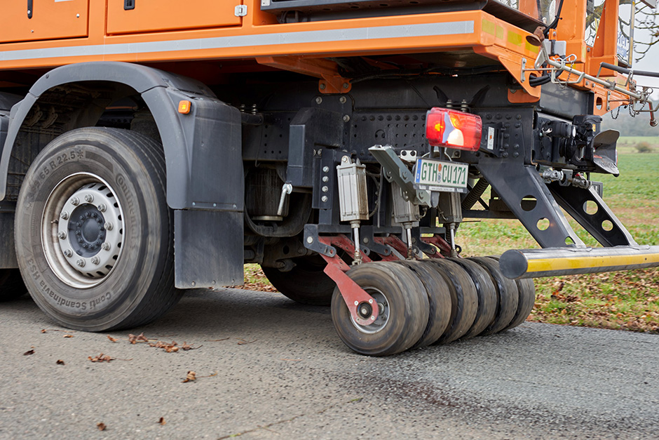 Es hat Arbeitsmaterialien wie Bindemittel, Splitt oder Wasser an Bord und ist für den Ein-Mann-Betrieb ausgelegt. Wahlweise kann die Sanierungsarbeit der Schadstellen entweder über einen Joystick vom Fahrerhaus ausgeführt werden – wobei Funktions-Eingaben über Touchscreen erledigt werden – oder per Funksteuerung von außerhalb des Fahrerhauses. Zur Baustellen-Organisation gehört eine Prozessdatenerfassung mit Datentransfer auf USB-Stick oder in ein Web-Portal.