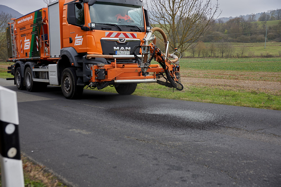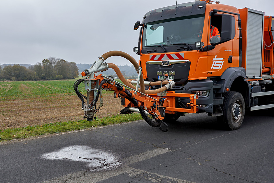 Die Thüringer Straßenwartungs- und Instandhaltungsgesellschaft mbH & Co. KG (TSI) ist als Straßenbetriebs-Dienstleister u.a. für die Kreis-, Landes- und Bundestraßen zuständig. Mit mehreren Dienstleistungen sind die Mitarbeiter auch bundesweit aktiv. Zur schnellen Sanierung von Rissen, Schlaglöchern und ähnlichen Beschädigungen an Verkehrsoberflächen setzt das Unternehmen nun bereits in der zweiten Saison einen Blow Patcher von Schäfer-Technic ein. Das Sanierungsfahrzeug vom Typ FAH6 ist dabei von Oldenburg bis Berchtesgaden im Auftrag von Kommunen und Landkreisen im Einsatz.