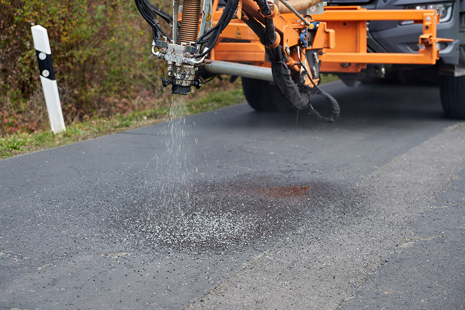 Eine Dosier-Automatik optimiert den Materialeinsatz, während der Misch-/Sprühkopf, der an einem hydraulisch steuerbaren Arm montiert ist, verschiedene Sanierungsschritte ausführt – vom Ausblasen der Schadstelle über das Einsprühen mit Bindemittel bis hin zum Einbringen und Überdecken mit Splitt. Danach fährt der Lkw mit herabgelassener Gummiradwalze über die Schadstelle, um das Sanierungsmaterial vollflächig anzudrücken bzw. zu verdichten. Wasserdüsen besprühen dabei die Lkw-Reifen sowie die Gummiradwalze, um ein Anhaften des Sanierungsmaterials zu unterbinden.