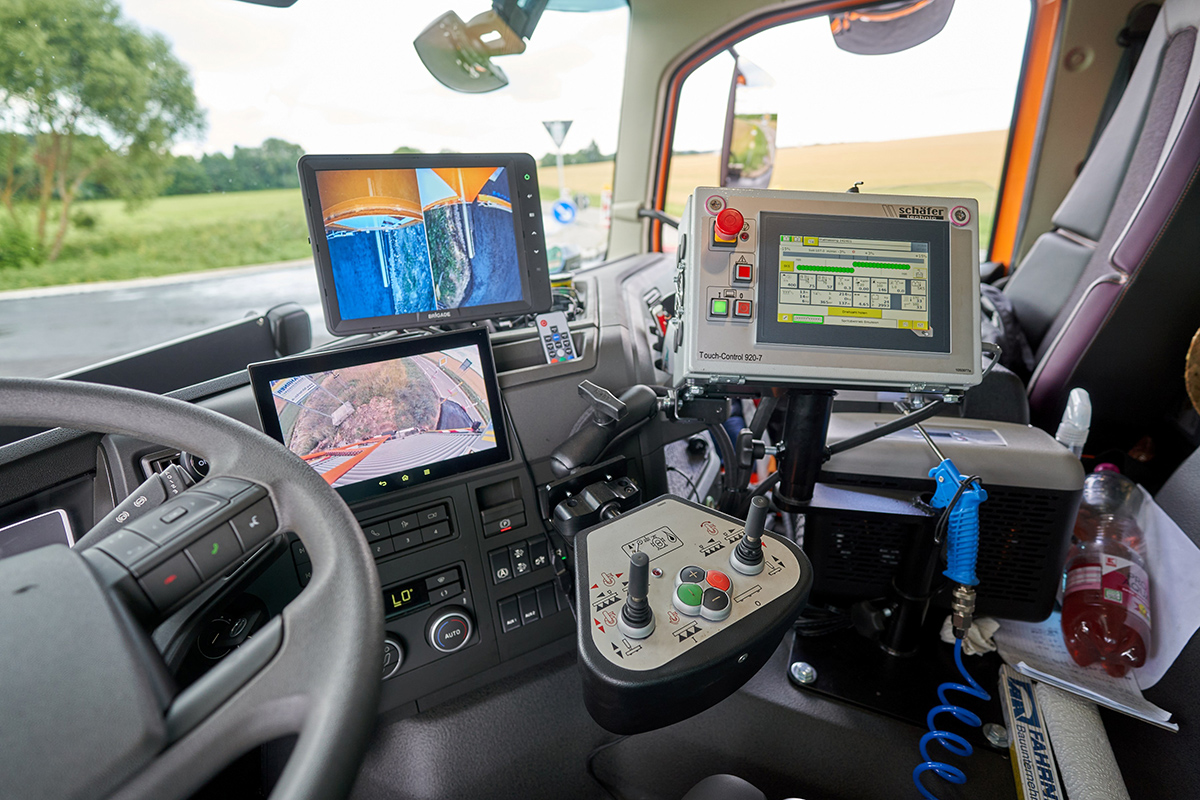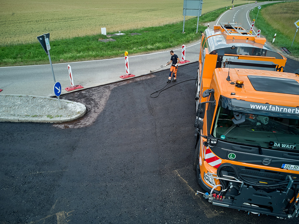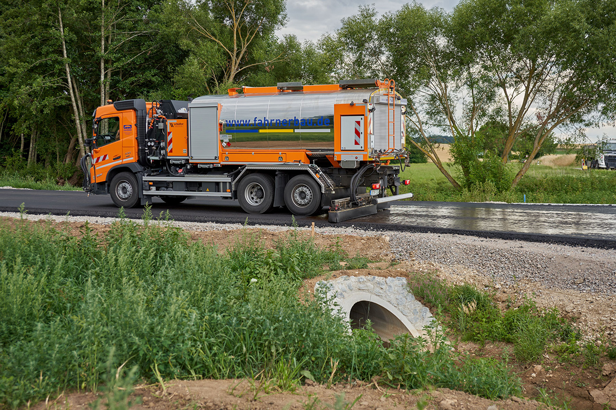 Nach gut 15 Jahren im Einsatz hat die Lkw-Bitumenvorspritzmaschine der Fahrner Bauunternehmung GmbH Verstärkung bekommen. Beim neuen Lkw handelt es sich um einen Drei-Achser mit gelenkter Nachlaufachse, der mehr Einsatzoptionen als sein zwei-achsiger Vorgänger bietet. Der 26-Tonner verfügt über zwei isolierte und beheizbare 3.500-Liter-Bitumentanks. So kann die Maschine Bitumenemulsionen mit unterschiedlichen Eigenschaften bei einer Fahrt mitnehmen. Am Heck ist der Spritzbalken stufenlos vom Fahrerhaus bis auf 4.600 mm Arbeitsbreite ausfahrbar und in der Höhe einstellbar. Automatisch erfolgt die Zu- bzw. Abschaltung der Spritzdüsen. Ebenfalls vom Fahrerhaus aus lässt sich die Dosiersteuerung des Bindemittels bedienen. Eine Rückraumüberwachung bietet zusätzlich eine optische Kontrolle des Arbeitsergebnisses. Natürlich verfügt der Wagen auch über eine Handspritzlanze mit zehn Metern Schlauchlänge, sowie über einen Wassertank und Reinigungsoptionen für alle Ausrüstungen.