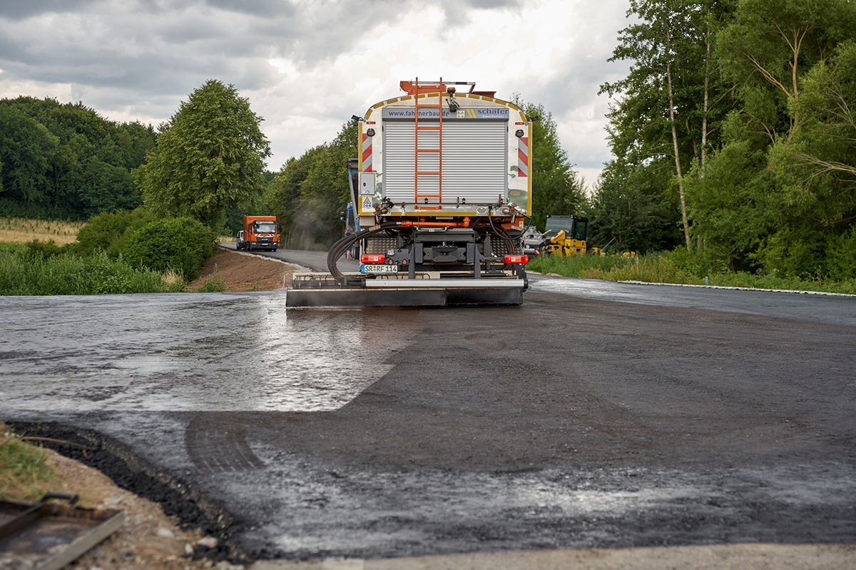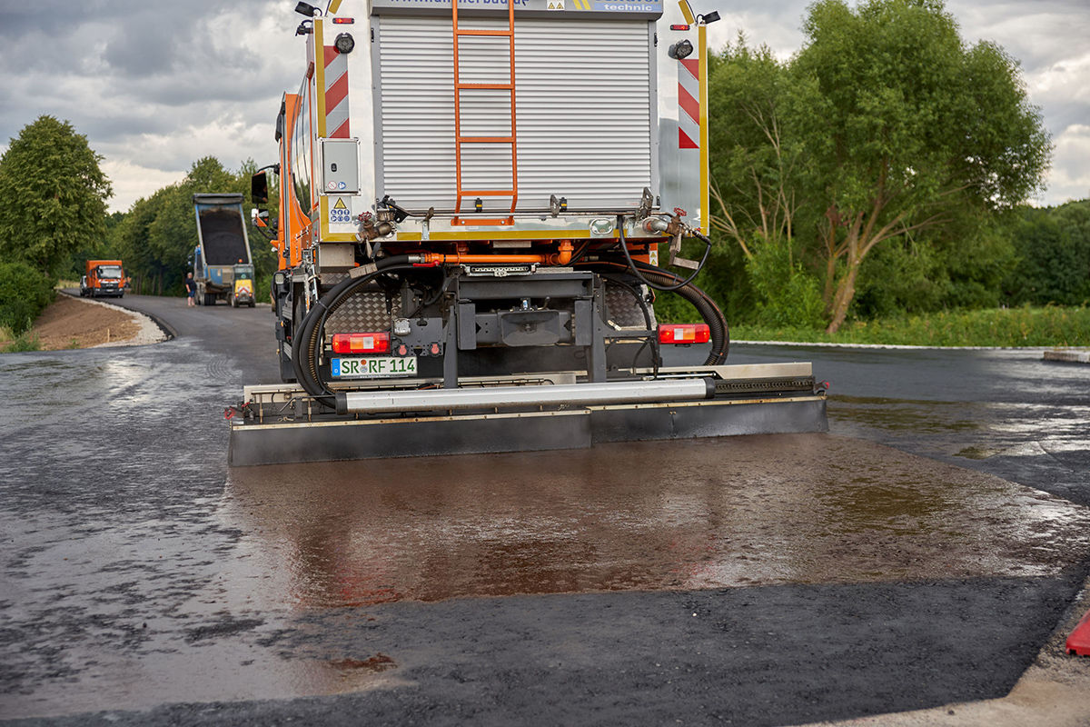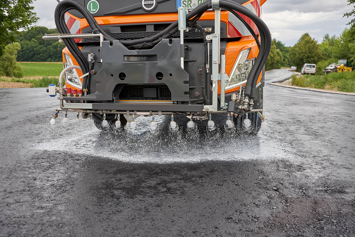 Je nach Baustellenplanung, aber auch zur Berücksichtigung der Witterung kann es erforderlich sein, Kalkmilch auf die Bitumenemulsion auszubringen. Frontseitig am Lkw ist dazu eine Kalkmilch-Spritzanlage verbaut. Die Kalkmilch führt der Lkw in einem separaten Tank mit. Nach dem Aufsprühen der Kalkmilch kann die behandelte Fläche sofort befahren werden. Deshalb kann der Einbau der nächsten Asphaltschicht unmittelbar auf die noch feuchte Oberfläche erfolgen, was zu einer Zeitersparnis im Baufortschritt führen kann. Denn bei vielen Asphaltbauprojekten treten während der heißen Sommermonate spezifische Herausforderungen auf. Wenn Baustellenfahrzeuge über die dunkle und aufgeheizte Bitumenemulsionsschicht fahren, kann das reine Bindemittel an den Reifen haften bleiben und weggetragen werden. Dies führt nicht nur zu erheblichen Verunreinigungen der betroffenen Bereiche, sondern birgt die Gefahr einer partiellen Beeinträchtigung des Schichtenverbunds. Eine beschädigte Haftbrücke
