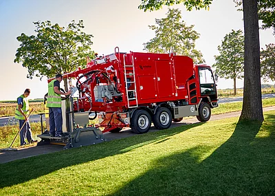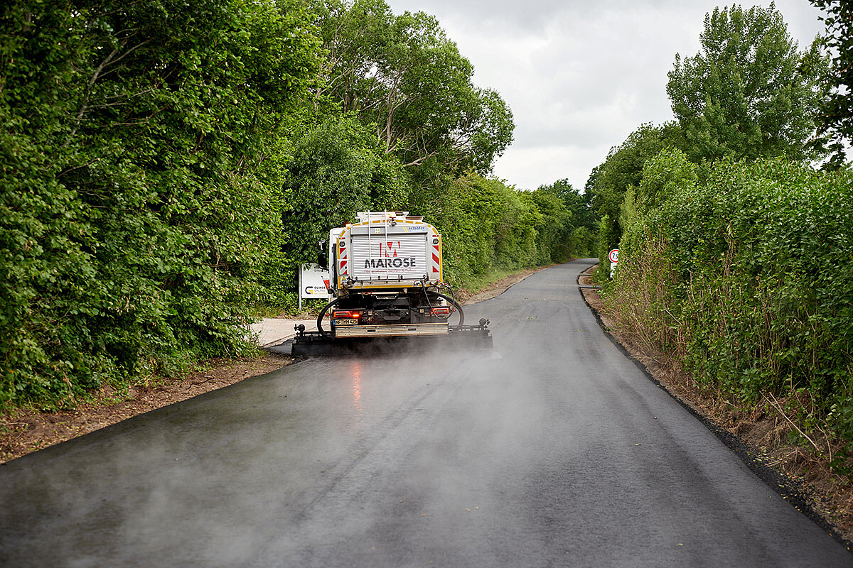 Der 18-Tonnen-Zweiachser ist kompakt und wendig. Als Spritzbalken wählte Marose einen hydraulisch verstellbaren Variomat (Transportbreite 2.300 mm, max. Arbeitsbreite 4.600 mm). Kurvenbereiche oder Einmündungen lassen sich damit gut bedienen, und mit der Handspritzlanze lassen sich weitere kritische Zonen bearbeiten. Anzeige-Displays erlauben alle wichtigen Einstellungen und Überwachungen für einen vollen Ein-Mann-Betrieb vom Fahrerhaus aus.