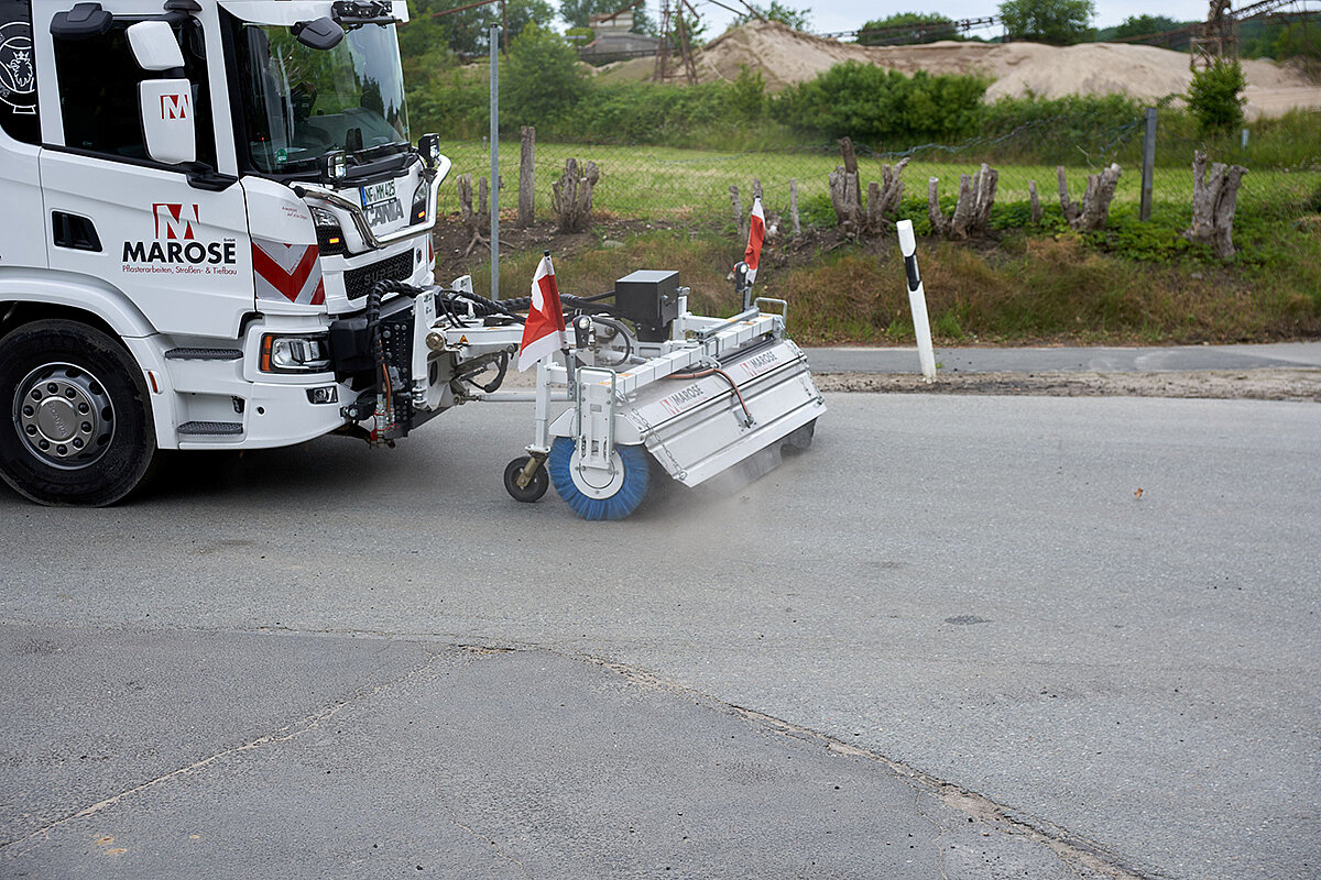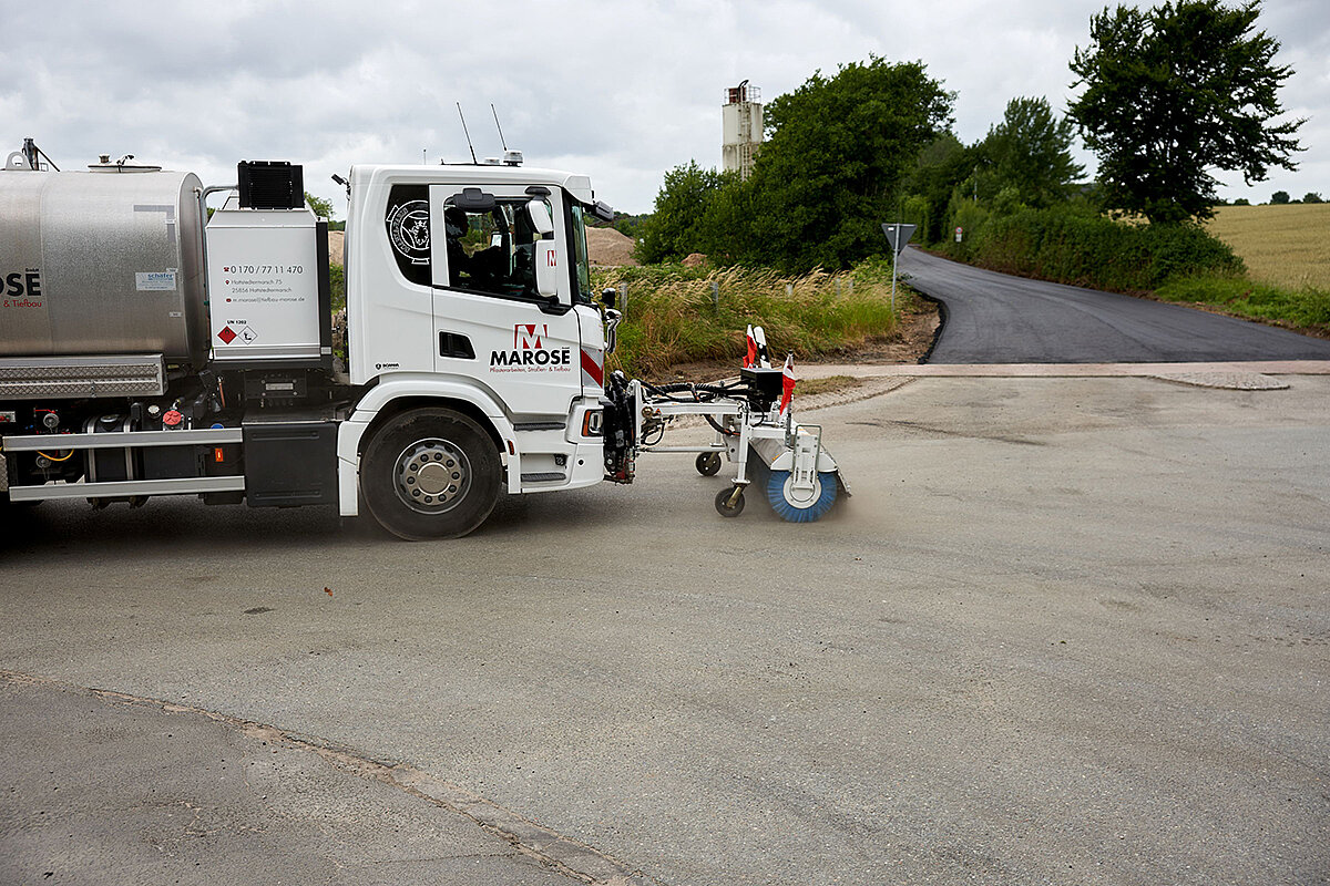 Einen Zusatz-Nutzen zum Fahrzeug bietet die seitlich verstellbare Frontkehrmaschine. Gefräste oder verschmutzte Oberflächen können damit auf das Anspritzen vorbereitet werden. Für eine gute Verbindung zwischen Asphalt-Deckschicht und Unterbau sorgt die aufgebrachte Bitumen-Emulsion.