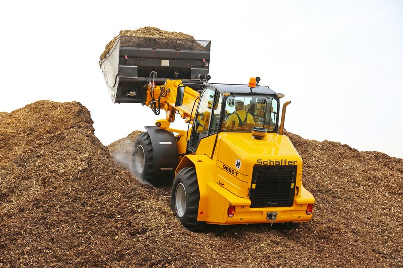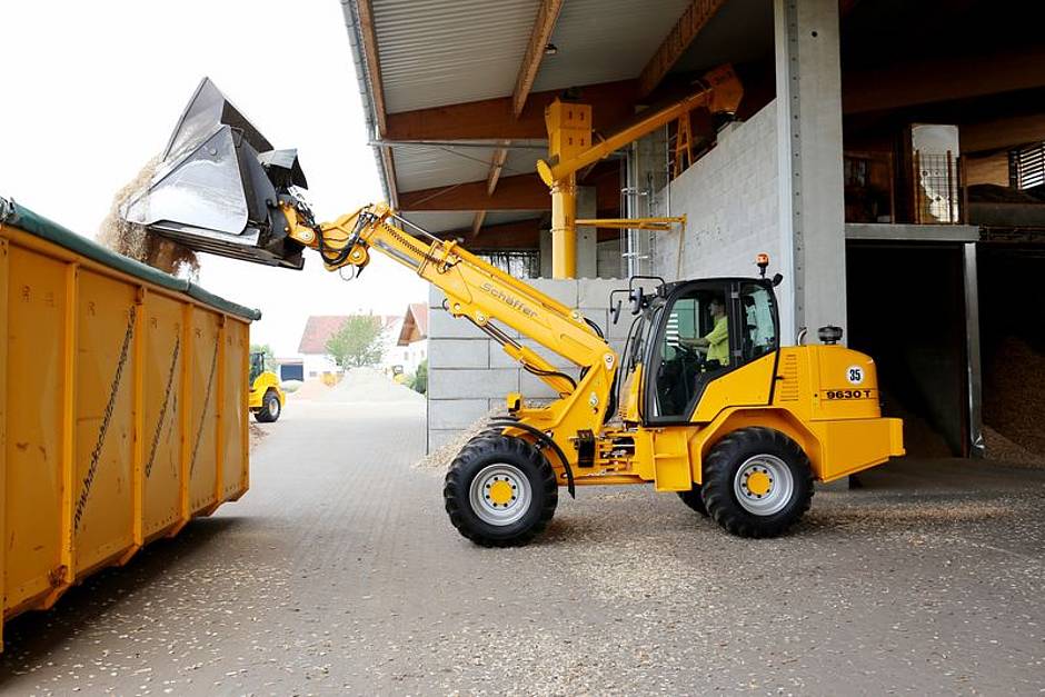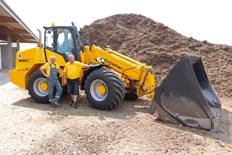 Karl Koppermüller erinnert sich noch gut als die Entscheidung für seinen ersten Schäffer, dem 9310 T, im Jahr 2009 gefallen ist. „Ich war auf der Suche nach einer kompakten Maschine für permanente Ladearbeiten. Grundvoraussetzung war, dass der Lader in einem Container auf dem LKW transportiert werden kann. So können wir die Maschinen flexibel an unterschiedlichen Orten einsetzen.“ Dabei hat der Unternehmer auch vierradgelenkte Teleskoplader ins Auge gefasst. „Wir haben auch Teleskoplader getestet. Zwar ist hier die Hubhöhe noch etwas größer, sie kamen aber bei Weitem nicht an die Agilität, die Schnelligkeit und die Übersicht der knickgelenkten Teleradlader von Schäffer heran. Auch mit den Schäffer-Ladern können wir die Hackschnitzel mit einer Hochkippschaufel bis zu 9 m hoch aufschieben. Da war die Entscheidung schnell auf Schäffer gefallen. Kein anderer Hersteller konnte einen Teleradlader in dieser Dimension anbieten.“