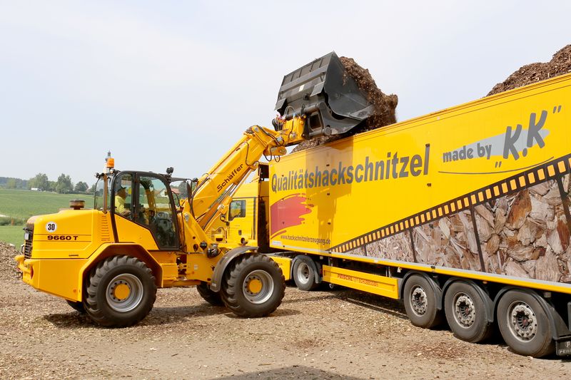 Auf dem Betrieb werden 80.000 m3 Hackschnitzel pro Jahr produziert. Die Lader bewegen aber eine weitaus größere Menge, ist sich Karl Koppermüller bewusst. „Im Grunde genommen transportieren wir mit den Ladern ein Vielfaches davon. Vom Zusammentragen der Äste am Einsatzort über das Befüllen der Sortieranlage nach dem Häckseln, die Entnahme der sortierten Hackschnitzel, das Aufschichten und Einlagern bis hin zum Beladen der Container für den Abtransport wird jedes Hackschnitzel mehrmals von einem Schäffer Lader bewegt.“ Besonders beeindruckt zeigt sich Karl Koppermüller, wie schnell sein großer Schubbodensattelzug (Fassungsvolumen 94 Schüttraummeter) mit dem 9660 T und der Großraum-Hochkippschaufel befüllt ist: „In nicht einmal 20 Minuten ist der komplette Sattelzug beladen.“
