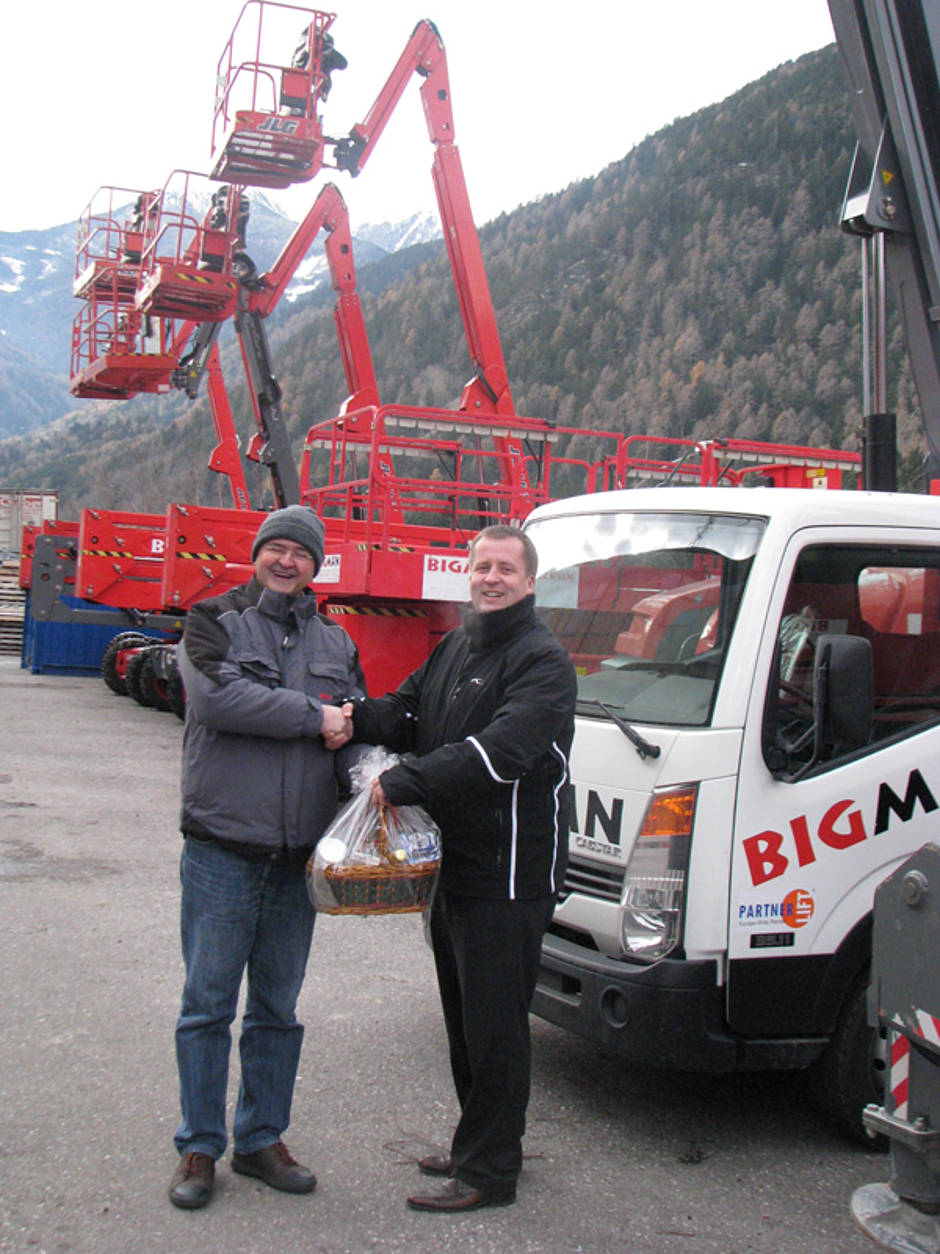 Weiteren Zuwachs erhält die Kooperationsgemeinschaft PartnerLIFT durch die Firma Bigman aus Italien, die Ihren Hauptsitz in Vahrn bei Bozen hat. Damit sind nun insgesamt 100 Unternehmen mit 132 Mietstationen bei PartnerLIFT organisiert, und Italien kommt als weiterer europäischer Standort für PartnerLIFT hinzu. Anlässlich dieses Jubiläums überreichte der Geschäftsführer von PartnerLIFT, Kai Schliephake (hier rechts im Bild), dem Inhaber und Geschäftsführer von Bigman, Herrn Horst Harasser, einen kleinen Präsentkorb mit norddeutschen Spezialitäten.