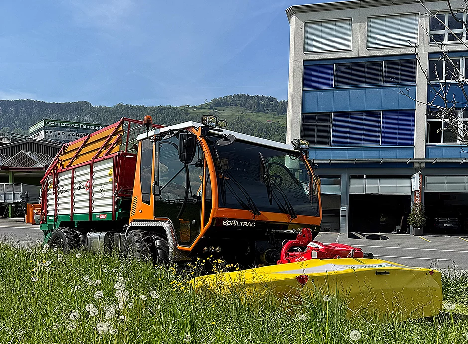 Die Geräteträger der Schiltrac Fahrzeugbau GmbH überzeugen durch Leistung, Kompaktheit und Vielseitigkeit. Trotz seiner kompakten Bauweise bietet der Schweizer „Alleskönner“ bemerkenswerte Aufbaukapazitäten – und das in einem Umfang, den man sonst eher von größeren Maschinen kennt. Ein Beispiel für die Kombination aus Größe, Leistung und Flexibilität ist der Einsatz eines Drei-Meter-Scheibenmähwerks von Pöttinger mit Direktaufnahme des Mähguts über den integrierten Lüönd-Hecklader – mit einem Ladevolumen von bis zu 39 m³.