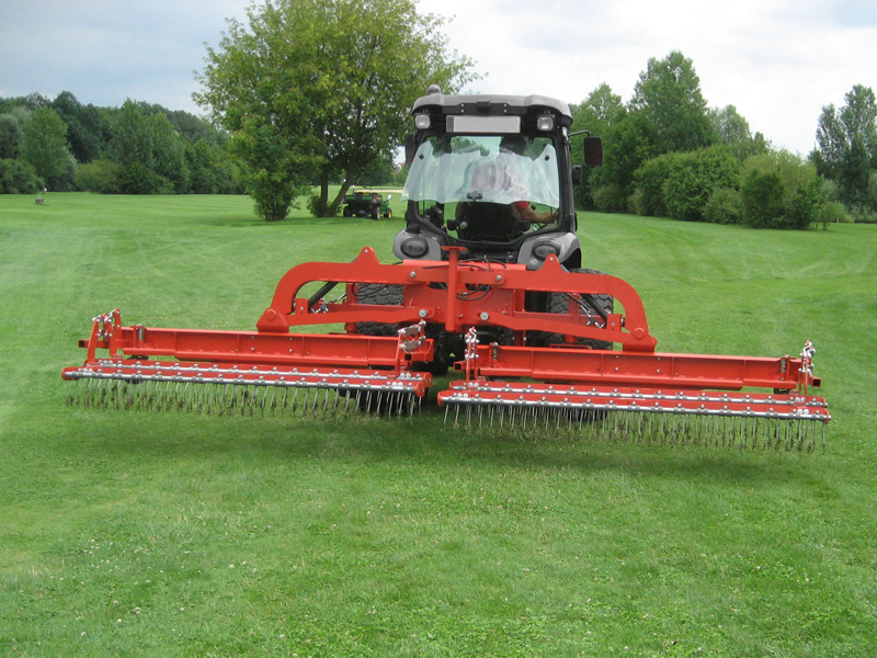 Hier gibt es künftig fünf Versionen mit Arbeitsbreiten von 160 bis beachtlichen 690 cm. Technologisch setzt Wiedenmann auf eine Parallelogramm-Führung der Striegel, kombiniert mit einer hohen Fahrgeschwindigkeit bis 12 km/h. Die damit erzeugten aggressiven Schwingungen ziehen den Rasenfilz kraftvoll aus der Grasnarbe. Über Laufrollen lässt sich die Arbeitstiefe einstellen. Die Zinken hat Wiedenmann vierreihig angeordnet, um einen feinen Strichabstand von 20 mm zu erhalten: Klein genug, um ein sauberes Vertikutierbild zu erzielen, und zugleich groß genug, um Verstopfungen zwischen den einzelnen Zinken wirksam vorzubeugen. Hydraulikzylinder bringen das Gerät schnell von der Arbeits- in die Transportstellung.