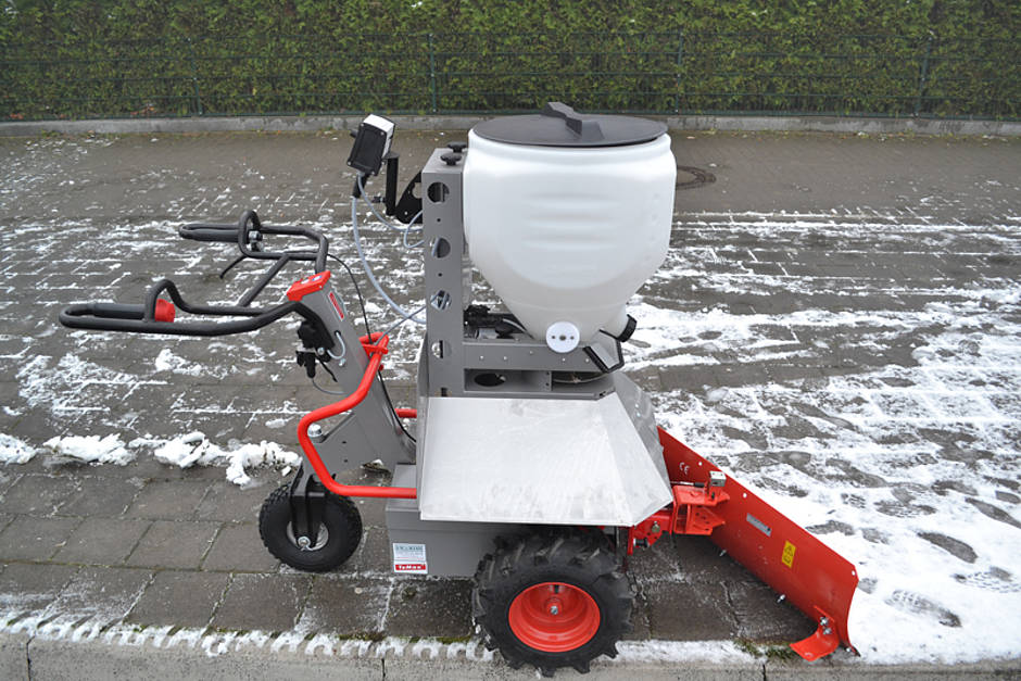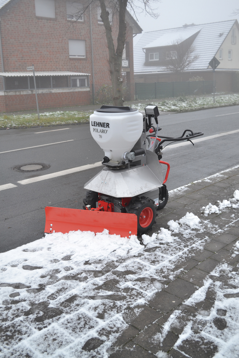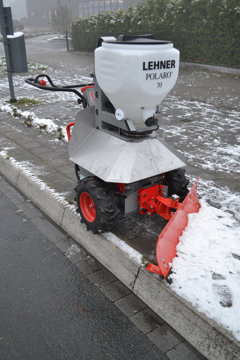 Der Salzstreuer „Lehner Polaro 70“ für den TeMax kann bis zu 90 kg Streusalz fassen und lässt sich ganz einfach über sein Steuerpult bedienen. Die Streubreite kann stufenlos zwischen 0,8 und sechs Meter angepasst werden und bietet damit höchste Flexibilität und Zeitersparnis auch beim Streuen von großen Flächen.
