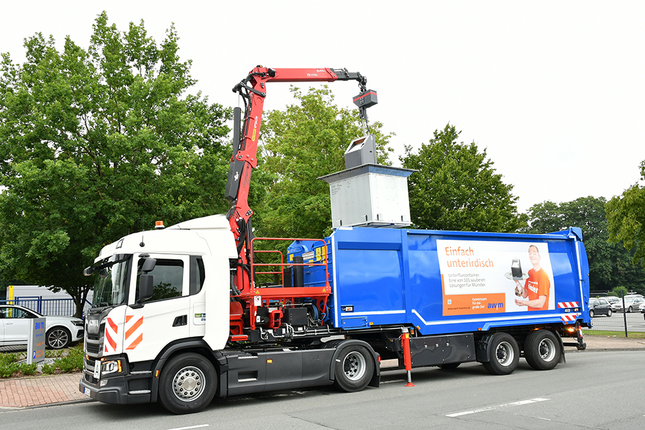 Das auf einem Drei-Achs-Lkw Scania G410 aufgebaute Unterflurcontainerfahrzeug ist mit dem Epsilon-Kran Q170LTR Triple-L von PALFINGER und einem Containerpress-System mit Verdichtungsfunktion von Bruns ausgestattet. Eine Besonderheit ist, dass das Abfallsammelfahrzeug dank mitlenkender Hinterachsen einen kleineren Wendekreis hat als andere Drei- oder Vier-Achser und dadurch in Innenstadtbereichen sowie an engen Containerstandplätzen besser zurechtkommt. Die Münsteraner sind stolz darauf, dass es derzeit kein weiteres Fahrzeug mit diesen Features gibt, das zur Entleerung von Unterflursystemen unterwegs ist.