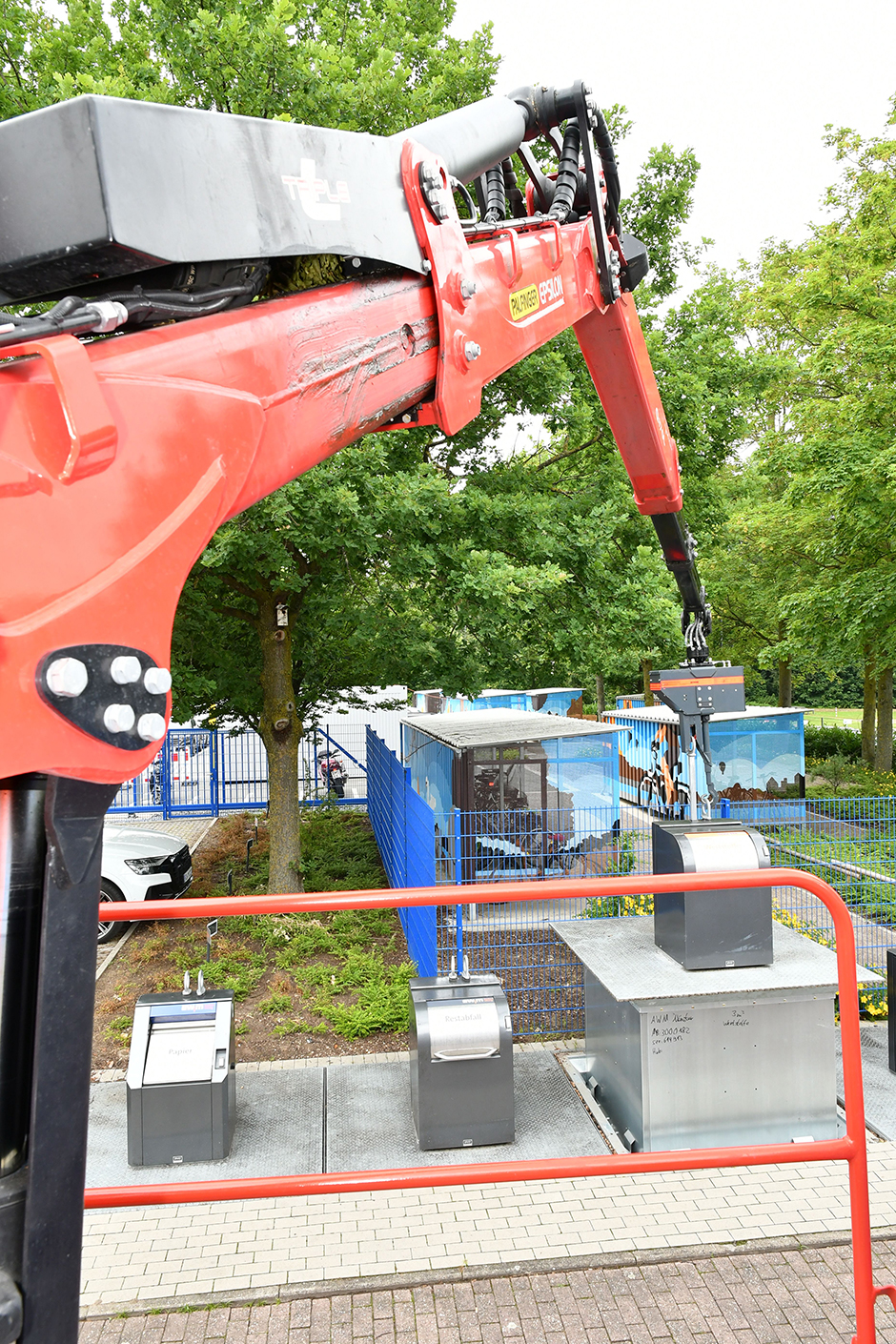 Stetig und zielgenau streckt sich der Arm des roten Kranes in Richtung der Metallsäulen. Dann greift er sich mit dem Haken eine der Ösen, hebt den bisher nicht sichtbaren Container in die Höhe und schwenkt ihn über das am Straßenrand abgestützte Fahrzeug. Auf Knopfdruck öffnet sich der Abfallbehälter und entleert sich in die Pressanlage. Dieser Vorgang wiederholt sich bei jedem der vier Unterflurcontainer, die mit verschiedenen Müllfraktionen gefüllt sind.