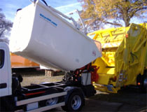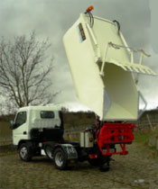 Mit der serienmäßigen Kippvorrichtung des Aufbaus ist es möglich eine direkte Übergabe des Sammelgutes in ein konventionelles Sammelfahrzeug durchzuführen.