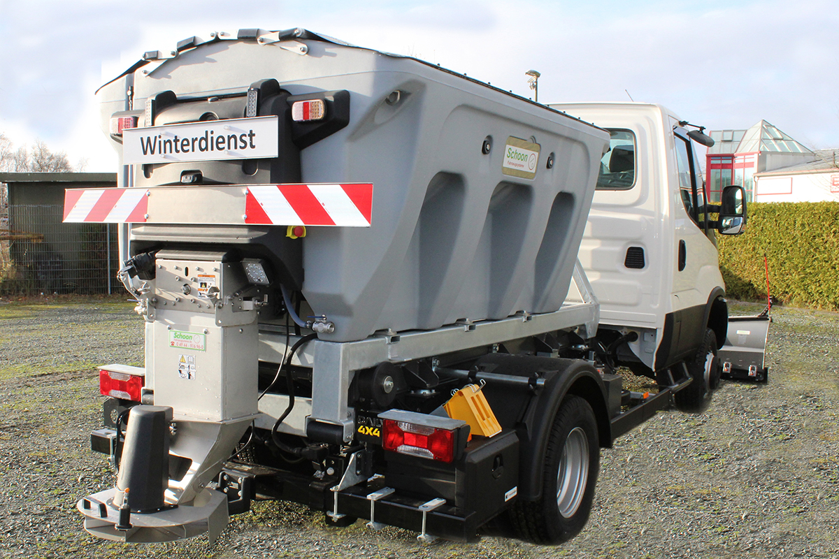Abhängig von der Nutzlast und Größe wird auf der Ladefläche mittels Zurrgurten ein Streugerät angebracht. Dabei stehen sieben Streugeräte des Typs „OMEGA“ zur Auswahl. Diese reichen von 110-Liter-Behältervolumen, optimal für Kastenwagen geeignet, bis hin zu 1.600-Liter-Behältervolumen. Wahlweise sind die Streuer mit GPS-Unterstützung, geschwindigkeitsabhängiger Mengenregulierung und modernster Steuertechnik erhältlich. Die Ausbringmenge zur Verteilung von Salz, Granulat, Sand-Gemisch und Splitt kann bequem über ein Bedienteil vom Fahrersitz aus stufenlos eingestellt werden. Aus Kunststoff und Edelstahlteilen werden die Streugeräte gefertigt und sind somit gut an den Winter angepasst.