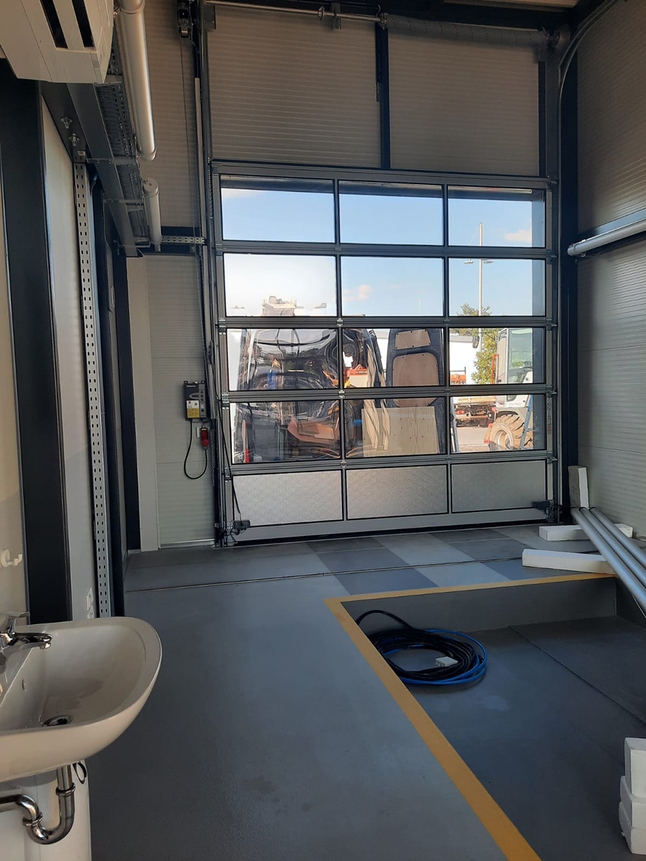 Nach intensiven Beratungsgesprächen wurden fünf Prototypen für Prüfstände in verschiedenen Größen und Ausführungen entwickelt. Bereits 15 Standorte wurden von dem Modulbau-Spezialisten aus Stadtlohn beliefert. Der Aufbau ist dabei immer ähnlich, robuste Thermowände bilden die Außenfassade. Es gibt Büroräume, WC, einen Technikraum und eine oder mehrere Prüfhallen mit Sektionaltoren, Hebebühne und Bremsenprüfstand.