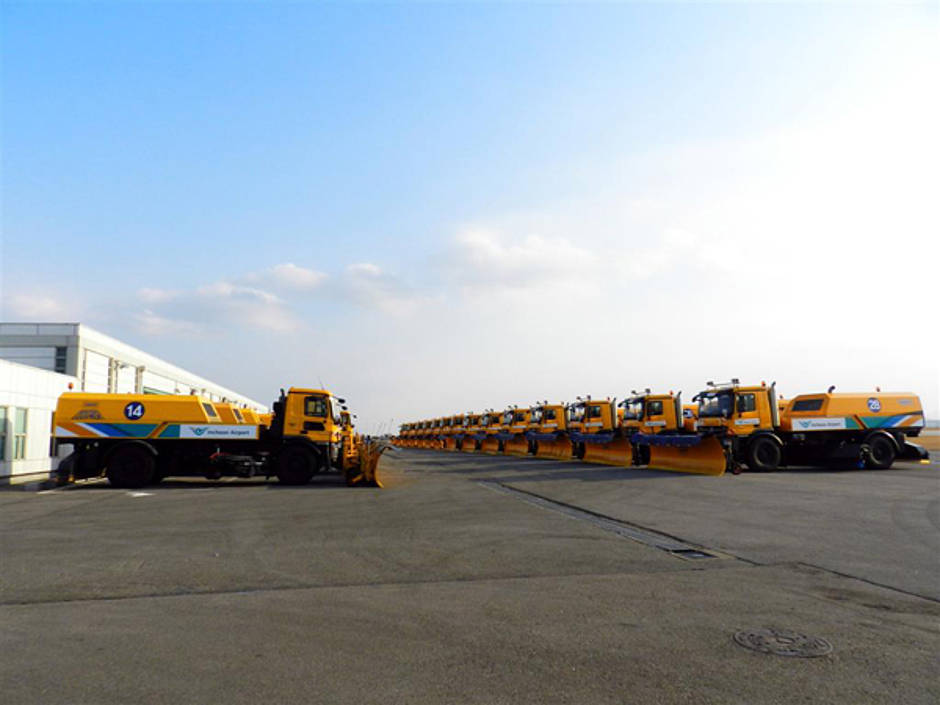 Sun Ryu, Betriebsleiter des Flughafens übergeben. Damit sind insgesamt 28 Mercedes-Benz Actros im Einsatz des modernen Flughafens. Ausgestattet sind die Mercedes-Benz Actros mit Kehrblasmaschinen des Typs „CJS“ von Aebi Schmidt. Mit einer Räumbreite bis zu 3560 mm befreien die Fahrzeuge das Areal des südkoreanischen Flughafens, über Schneepflug, Kehrwalze und Hochdruckgebläse, von Schnee und Eis.