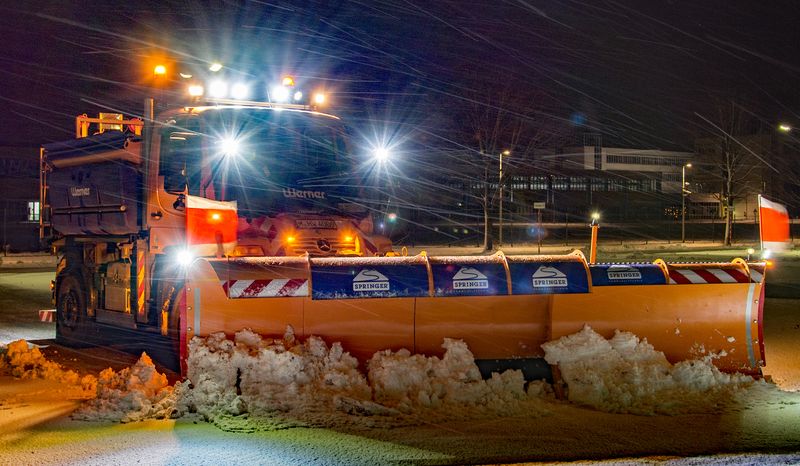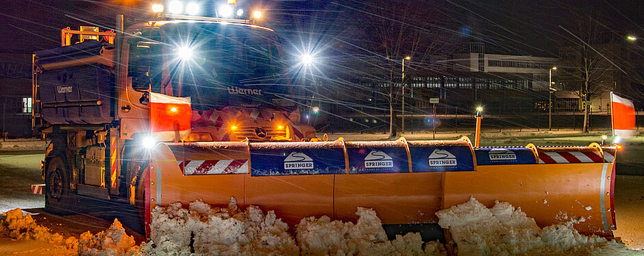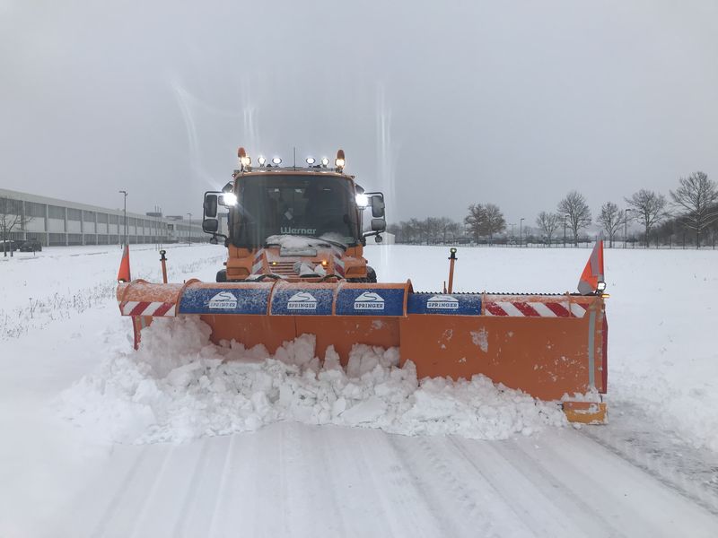 So wechselhaft wie das Wetter beim Räumeinsatz sind oft auch die Einsatzbedingungen für Mensch und Maschine. Mehrspurige Fahrbahnen fordern beispielsweise hohe Räumbreiten, Fahrbahnverengungen sowie Hindernisse wiederum geringe Räumbreiten. Die Lösung hierfür ist der „Vario Wing“ der Fa. Springer Kommunaltechnik. Hierbei handelt es sich um einen Seitenschneepflug mit hochsteigenden Pflugscharen. Die Besonderheit des Pfluges ist jedoch die variable und stufenlose Verbreiterung der Räumbreite auf der linken Seite um bis zu 1,20 m. Innerhalb weniger Sekunden und während der Fahrt kann somit vollhydraulisch die Räumbreite geändert werden.