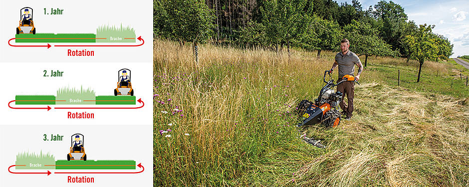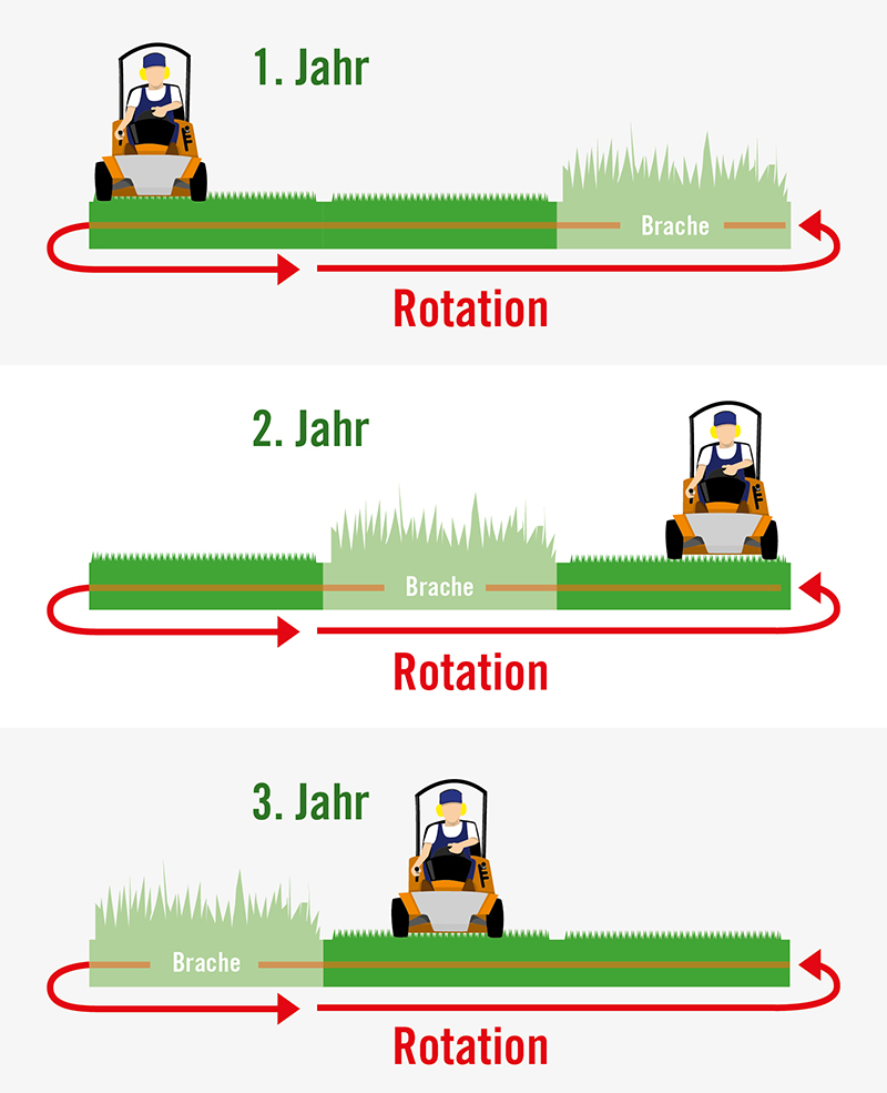 Eine großflächige und zeitgleiche Mahd sollte vermieden werden, um wertvolle Lebens- und Rückzugsräume nicht zu zerstören. Stattdessen gelte es, ungemähte Areale als Ausweich- und Fluchtflächen für Tiere zu erhalten. Hier können sich zudem Teilpopulationen der Flora ungestört weiter entwickeln und danach die gemähten Flächen wieder besiedeln. Diese sogenannten Altgrasstreifen sollten im Idealfall zehn auf 50 Meter groß sein und erst im Folgejahr gemäht werden. Je nach Möglichkeit und Schutzziel sollten zehn bis 20 Prozent der Fläche ungemäht belassen werden. Empfohlen wird bei abschnittsweisem Mähen von Flächen das Prinzip der wandernden und rotierenden Brachstreifen. Wenn die gesamte Fläche hingegen innerhalb von zwei Wochen gemäht werden soll oder muss, ist die sogenannte Streifen- oder Mosaikmahd zu empfehlen.