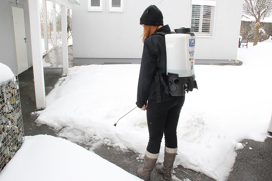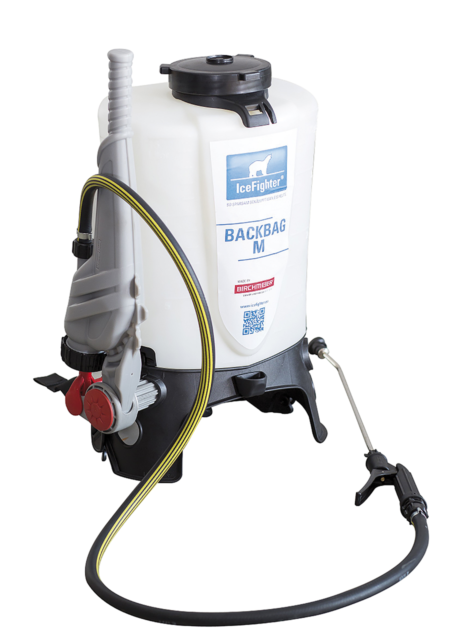 Wer diesen Winter lieber Sole anstatt Salz ausbringen möchte, kann auf den IceFighter Backbag von Eco Technologies zurückgreifen. Ausgestattet sind die tragbaren Solesprüher mit stufenlos einstellbaren, gepolsterten Schultergurten mit Klick-System. Der 15 Liter transparente Kunststofftank verfügt über praktische Griffmulden sowie über eine große Einfüllöffnung mit Sieb zum einfachen Befüllen. Das Ausbringen der Sole erfolgt über eine soleresistente 50-cm-Handlanze aus vernickeltem Messing mit Flachstrahldüse. Mit einer Tankfüllung lassen sich bei einer durchschnittlichen Sprühmenge rund 500 m² bearbeiten. Beim Pumpenantrieb haben Anwender die Wahl: entweder erfolgt er über eine Handpumpe oder elektrisch über einen wechselbaren Li-Ion Akku.