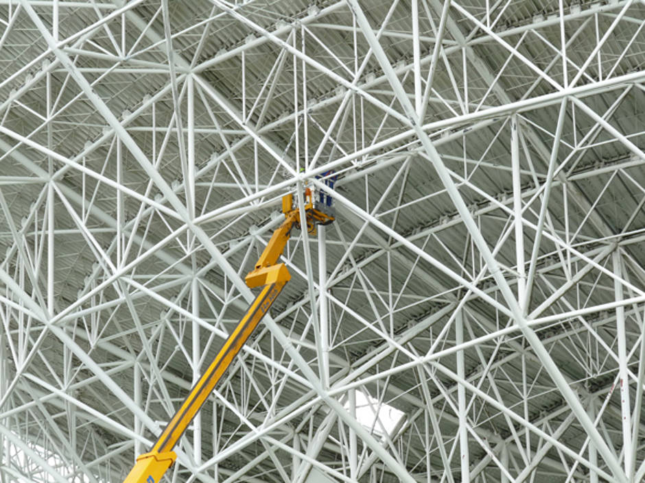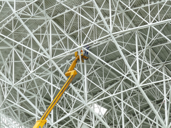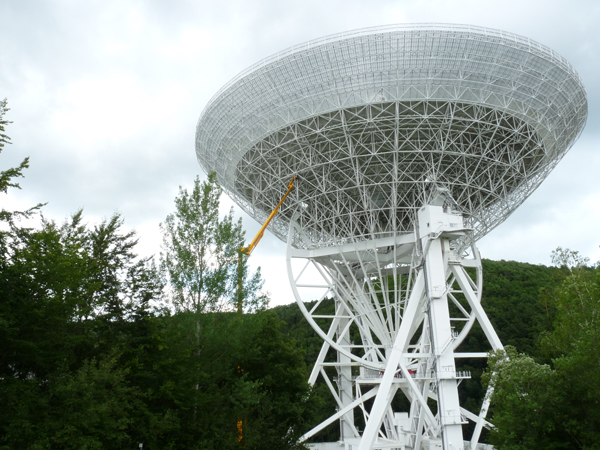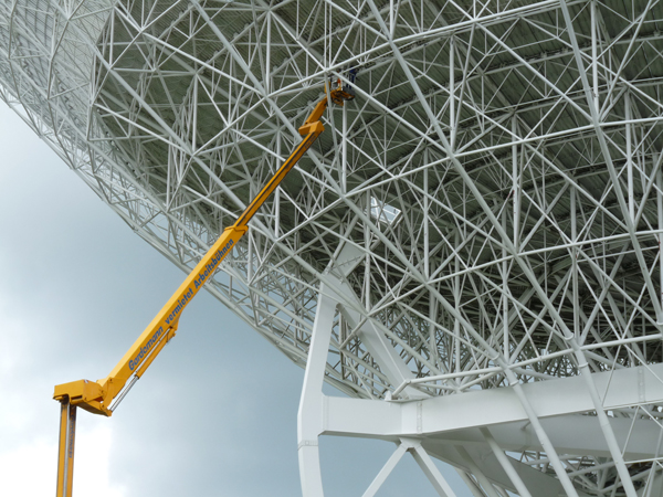 Mit 100 Metern Durchmesser gehört das Radioteleskop Effelsberg zu den größten vollbeweglichen Radioteleskopen der Welt. Damit die Teleskopschüssel die weit gereisten Radiosignale optimal reflektiert, ist eine schneeweiße Oberfläche unabdingbar. Seit der Inbetriebnahme in den 1970er Jahren werden daher permanent Anstreicharbeiten an der riesigen Schüssel vorgenommen. Die Hauptschwierigkeit war bisher, die unzähligen Stahlstreben direkt im Gestänge zu erreichen. Erstmals schafft nun eine Spezialkonstruktion Abhilfe, die gemeinsam von Ruthmann und Gardemann entwickelt wurde.
