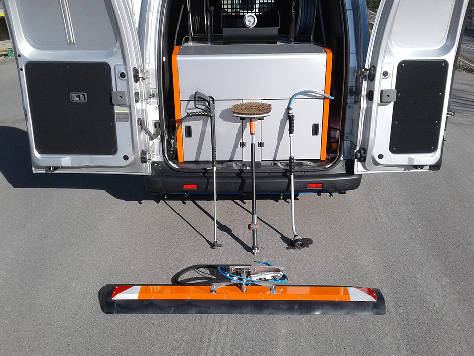 Heraus kam der „Splash“, ein modulares Reinigungssystem, das völlig plattform-unabhängig auf Pick-ups, Pritschenwagen, Anhänger oder auch in Lieferwagen montiert werden kann. Die Basis besteht aus einem Grundrahmen mit aufgesetztem Wassertank und einer eigenen Stromversorgung. Abhängig vom Einsatzfeld des Kunden, können dann weitere Module angebaut werden. Dabei reichen die Optionen von einer Niederdruck-Pumpe für die Grünflächenbewässerung, über verschiedene Hochdruckpumpen für unterschiedlichste Reinigungsaufgaben, Haspeln mit verschiedenen Schlauchkapazitäten, bis hin zu einem Straßenwaschbalken. Dieser ist mit wenigen Handgriffen montiert und kann bequem vom Fahrersitz aus gesteuert werden.