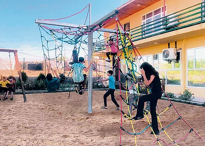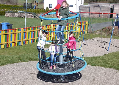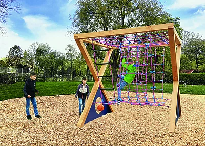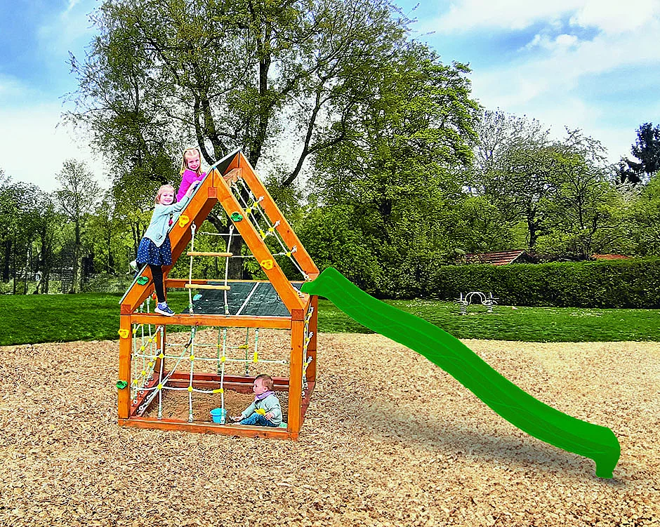 Das Sandkastenhaus, auch Domizil genannt, ist aus hochwertiger Lärche gefertigt und bietet eine tolle Spielmöglichkeit für Kinder. Es verfügt über ein Netzwerk aus 16 mm Herkulesseil, das sowohl Sicherheit als auch Spaß beim Klettern bietet. Ebenfalls umfasst die Ausstattung eine Leiter und eine Rutsche sowie ein Dach mit Kletterhilfen und einen Sandkasten. Alternativ ist das Spielhäuschen auch ohne Sandkasten lieferbar. Es hat ein Maß von 1,63 x 1,63 Meter. Mit einer Fallhöhe von 2,50 Meter ist es ideal für kleine Abenteurer. Die Rutschbahn hat eine Podesthöhe von einem Meter und ist circa 2,20 Meter lang. Wie das Häuschen besteht auch das Gestell aus Lärchenholz. Für viel Bewegung sorgt die Kombination aus Klettern und Rutschen, die ebenfalls die motorischen Fähigkeiten der Kinder fördert.