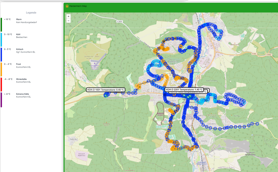 Die Ansicht der Daten wurde über eine Open-Source-Plattform realisiert. Hier kann der Nutzer auf einen Blick die durchschnittliche, maximale und minimale Straßentemperatur erkennen. Darunter erfolgt die Anzeige der aktuellen lokalen Wetterdaten. Auf der Karte bilden die einzelnen Mess-Punkte die entsprechende Buslinie. Die Punkte zeigen der Einsatzleitung anhand der Farbe, wie viel Grad auf der Fahrbahn gemessen wurden.