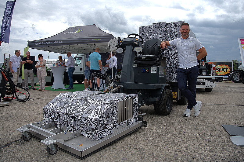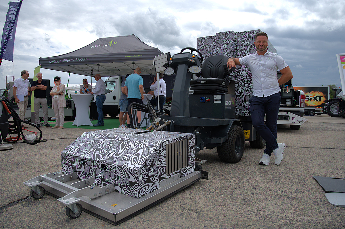 Wir haben einen Heizboiler drinnen, wir haben 450 Liter Wasser. Die Neuheit an dem Ganzen ist, dass wir mit dem Gerät, das auf Lithium-Eisenphosphat-Batterien basiert, das bedeutet wir haben überhaupt keinen Lärmpegel und nur minimale Emissionen vom Wasseraufheizer. Zusätzlich ist es möglich, Unkraut zu beseitigen, wie gewohnt mit unserer Keckex-Methode und aber auch elektrisch Hochdruckwäsche zu machen. Das bedeutet die Randbereiche oder wenn man irgendwo nicht hinkommt, kann man das natürlich auch händisch mit dem Gerät optimal beseitigen.“