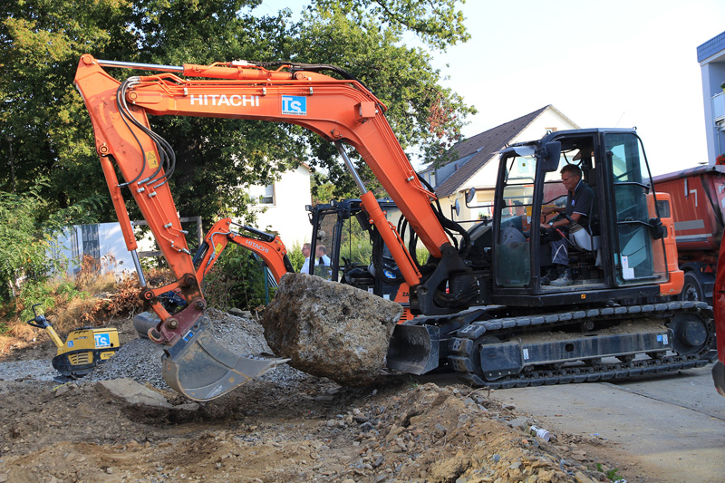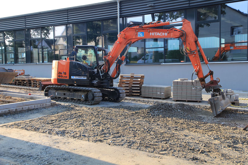 Seit April 2020 ist auch der größte Hitachi-Kompaktbagger, der ZX85-6, im Einsatz. Die Auftragslage verlangt danach, größere Erdmassen zu bewegen, und Sattelzüge schnell und effizient zu beladen. „Unsere Jungs sind mit dem ZX85 sehr zufrieden. Man hat eine sehr geräumige Kabine mit einer großen Umsicht. Das ist ein rundum robustes Gerät, das einwandfrei seine Aufgaben erfüllt. Die Größe ist auch gerade noch so kompakt, dass man auf Baustellen wie diesen gut arbeiten kann. Maschinentransporte können immer noch kombiniert in einer Fahrt erledigt werden: Service-Radlader und Kompaktbagger passen auf einen Tieflader. Durch die Gummipads können wir rangieren, ohne dass der Untergrund beschädigt wird. Wir sind rundum mit dem ZX85 zufrieden“, sagt Sebastien Sieg.