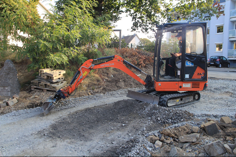 Er zieht Gräben, formt Oberflächen, verfüllt Material und kommt auch dorthin, wo andere Maschinen nicht mehr arbeiten können: Der ZX19-5 gilt bei Thyssen + Sieg als vielseitiger Springer und „Allzweckwaffe“, die mehrfach in der Woche per Pkw-Anhänger versetzt wird. „Für uns ist dieser Zweitonner fast universell einsetzbar. Das Beste ist, dass er sich so kräftig wie sonst ein Dreieinhalb-Tonner zeigt“, erklärt Sebastian Sieg. Mitarbeiter loben die verhältnismäßig sehr geräumige Kabine.
