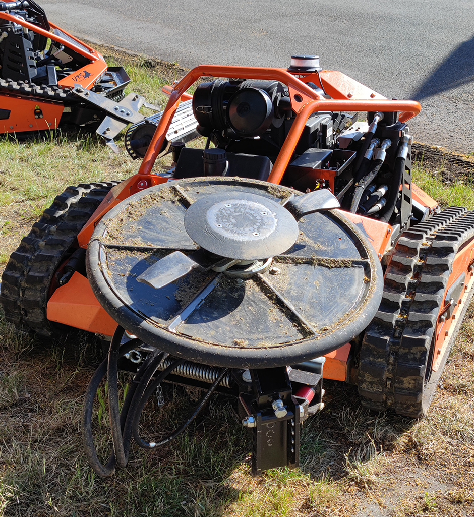 Über verschiedene Einstellungen in der Höhe, Schräge usw. lässt sich der FlexCUT mechanisch an die jeweiligen Bedürfnisse anpassen. Angetrieben wird er über die Zusatzpumpe am URS 100 und den Zahnradmotor. Mit den tropffreien Schnelltrenn-Kupplungen kann dieses Anbaugerät schnell und sicher an die Grundmaschine angeschlossen werden. Das Gerät ist federgespannt und kann über ein rotierendes, großdimensioniertes Gummirad randnah an die Hindernisse gefahren werden. Eine Federrückspannung – intern an den Tragarmen – führt den FlexCUT immer gegen den Anschlag zurück in die Neutralstellung.