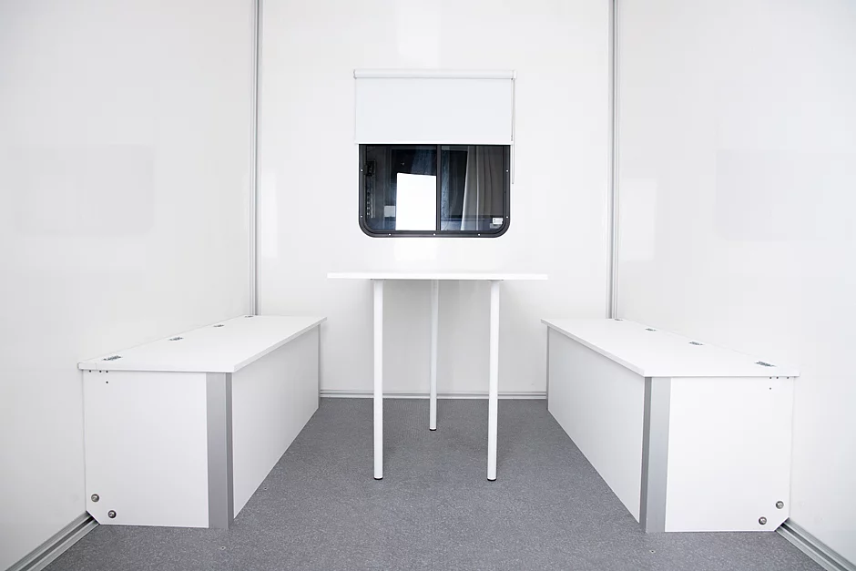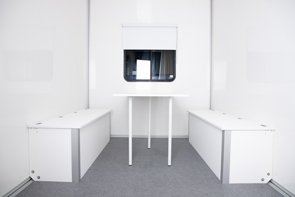 Ein mobiler Aufenthaltsraum, der Witterung ausgesetzt ist und regelmäßig Kollegen beherbergt, benötigt ein entsprechendes Klima. Deshalb sorgt ein Schiebefenster in der Rückwand des STEMA-Anhängers für Belüftung. Zusätzlich verbessert eine passive Zwangs-Entlüftung das Klima im Bauwagen. Durch sie bildet sich auch bei geschlossener Eingangstür eine Strömung zwischen ihr und der Rückwand des Bauwagens. So wird verhindert, dass sich Feuchtigkeit im Raum bilden kann.