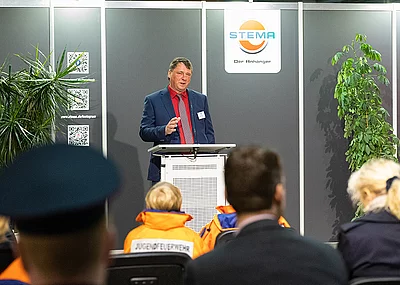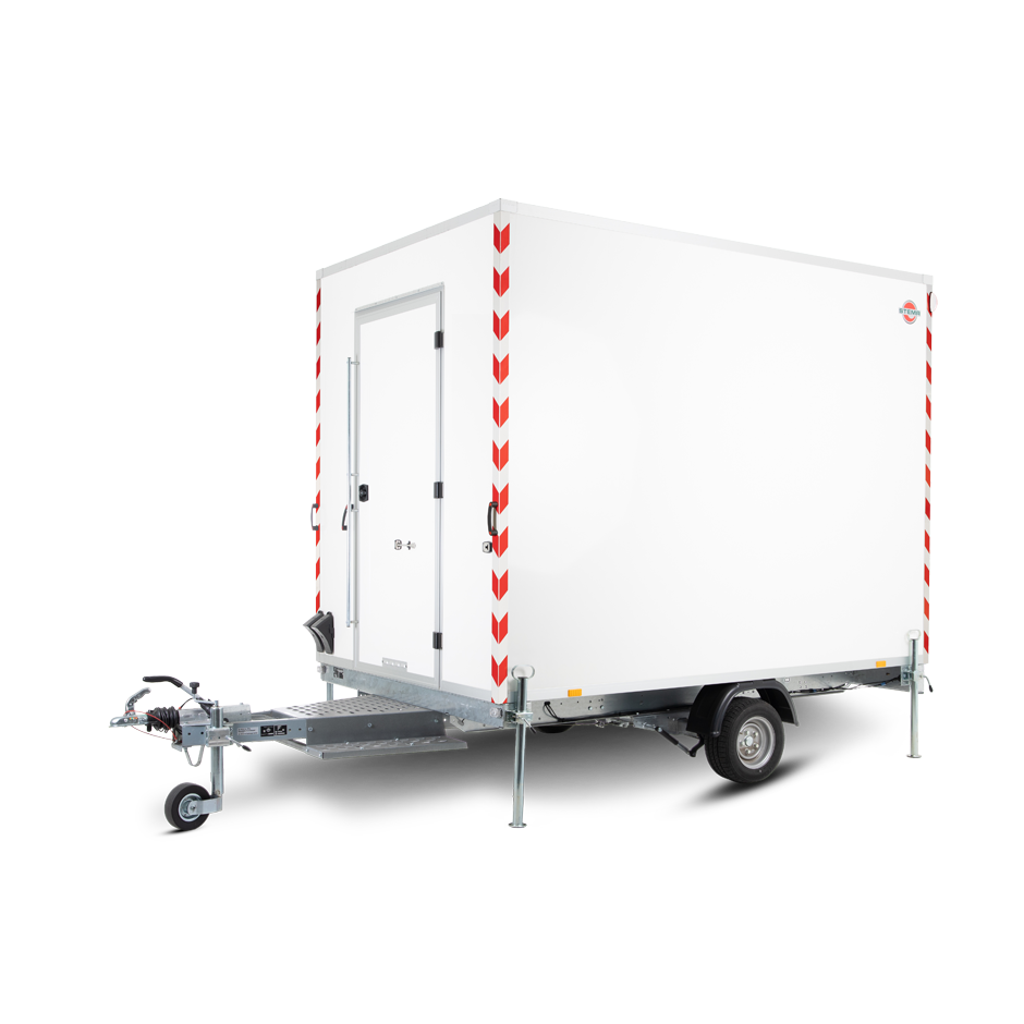 Damit ein Bauwagen für die Kollegen im Alltag Entlastung, Praxistauglichkeit und einen gewissen Komfort bietet, kommt es auf die Details an. Beispielsweise ist der STEMA-Anhänger mit einer Trittstufe auf der Deichsel versehen, die einen einfachen Zugang zur Tür in der Vorderwand ermöglicht. Dabei ist der Antritt rutschhemmend gestaltet – so ist selbst bei stark verschmutzten Arbeitsschuhen eine hohe Trittsicherheit gewährleistet.