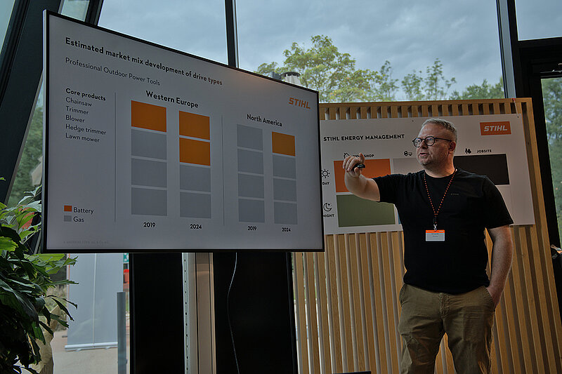 Verbrennermaschinen sind auf dem Rückzug, der Akku hat gesiegt. Bis 2030 könnten E-Maschinen-Verkäufe mehr als 60 Prozent des Gesamtumsatzes betragen, wie Stihl-CEO Michael Traub in seiner Keynote betont. Gute Nachrichten für das Unternehmen – und schlechte zugleich. Denn während sich die Schwaben als führender Kettensägenhersteller auf wachsende Umsätze freuen können, kommt die Entwicklung auf Kosten der heimischen Arbeitsplätze. Grund: In Deutschland seien die Produktionsbedingungen für Akkugeräte laut Traub zu schlecht. Und wenn der Anteil der in Deutschland verbliebenen Benzingeräte-Produktion am Gesamtabsatz geringer ausfalle, sei ein Stellenabbau unvermeidlich. Zwar gebe es in Südamerika, Afrika und Teilen von Asien nach wie vor eine stabile Verbrenner-Nachfrage, doch wie sich diese entwickelt, bleibt abzuwarten. Ein weiterer Grund für den Stellenabbau sei die Corona-Pandemie. Durch den sogenannten Cocooning-Effekt – also den Fokus der Verbraucher auf das eigene Haus oder den eigenen Garten – hat Stihl in den Pandemiejahren profitiert. Von dieser Euphorie beflügelt, habe das Unternehmen einfach zu viele Personen eingestellt. Das Thema Personalabbau beschäftigt Stihl schon seit dem Frühjahr. Traub hatte verkündet, den Mähroboter iMow zukünftig in China produzieren zu lassen, wodurch 100 Stellen gestrichen wurden. Auch ein danach angekündigter, weltweiter Abbau von 500 weiteren Stellen reiche als Einsparmaßnahme und Reaktion auf die wirtschaftliche Situation nicht aus.
