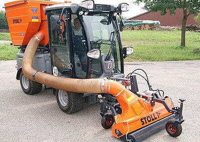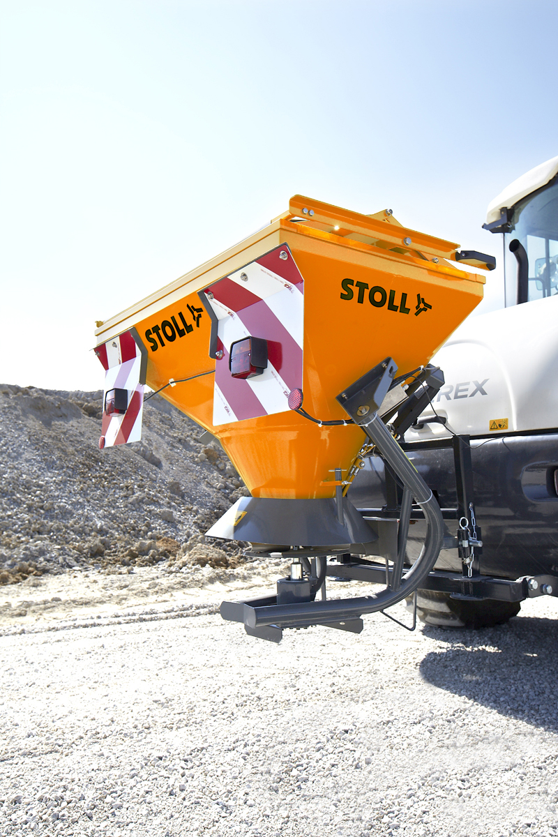 In Abstimmung mit Herstellern wurde ein Streugerät als Sondermodell für den Anbau an Radlader entwickelt. Der speziell gefertigte Streugutbehälter mit einem Inhalt von 355 Litern ermöglicht einen kurzen Anbau – sowie die Erledigung der Wartungsarbeiten am Fahrzeug bei angebautem Gerät. Streugüter wie Sand, Salz, Splitt Granulat oder Mischungen können eingesetzt werden. Ein kegelförmiger Auslauf und kräftige Rührwerkzeuge garantieren gute Entleerung. Der großvolumige Behälter lässt sich gut befüllen, das Planenklappdach kann mit einer Hand zeitsparend geöffnet bzw. geschlossen werden.