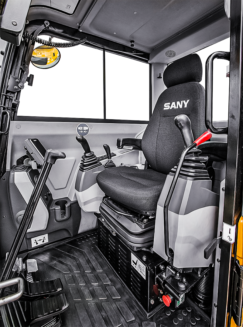 In der Kompaktklasse erweitert SANY das Angebot um den SY80U – einen Kurzheckbagger in der Acht-Tonnen-Klasse. Er verspricht viel Leistung bei geringem Kraftstoffverbrauch, eine Menge Komfort bereits in der Serienausstattung und gewohnt hochwertige Komponenten. Der SY80U folgt einem klaren Konzept: Er bietet in der Kompaktklasse die Leistung, Ausstattung, Effizienz und vor allem den Komfort eines Großbaggers. Beispiele hierfür sind der gefederte Textilsitz und die ergonomischen, intuitiven Bedienelemente, wie beispielsweise das übersichtliche Display. Die gut isolierte sowie schwingungsarm gelagerte Kabine sorgt im Zusammenspiel mit der sauber geführten Gummikette für ein angenehmes Arbeiten über längere Zeit.